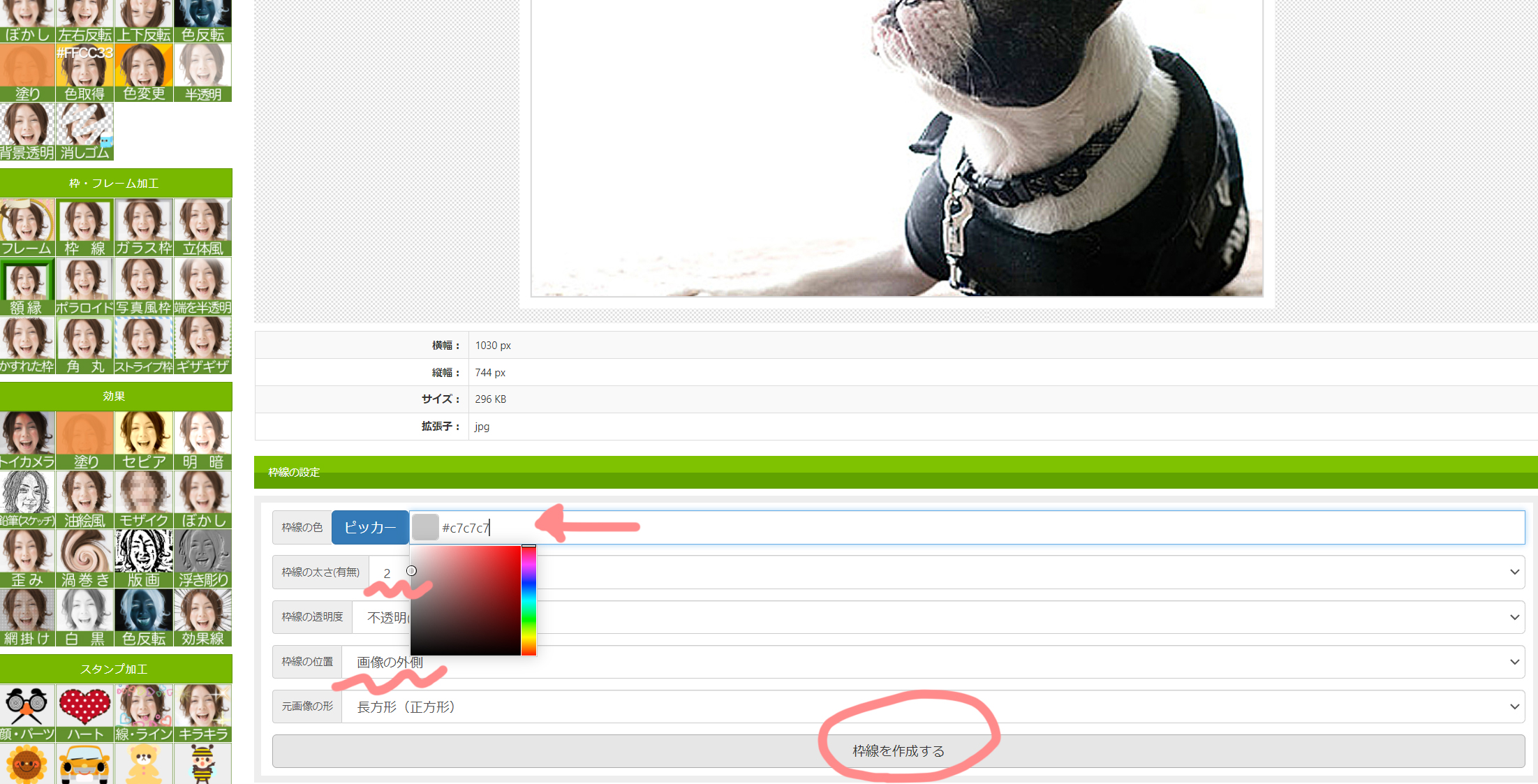 ②写真に枠を付けます。余り強い感じで無く、灰色(薄目)で、今回は、数字は2にしました、必ず、内側につけて下さい。外側ですと、2回目に重ねた時に、消えてしまいます。