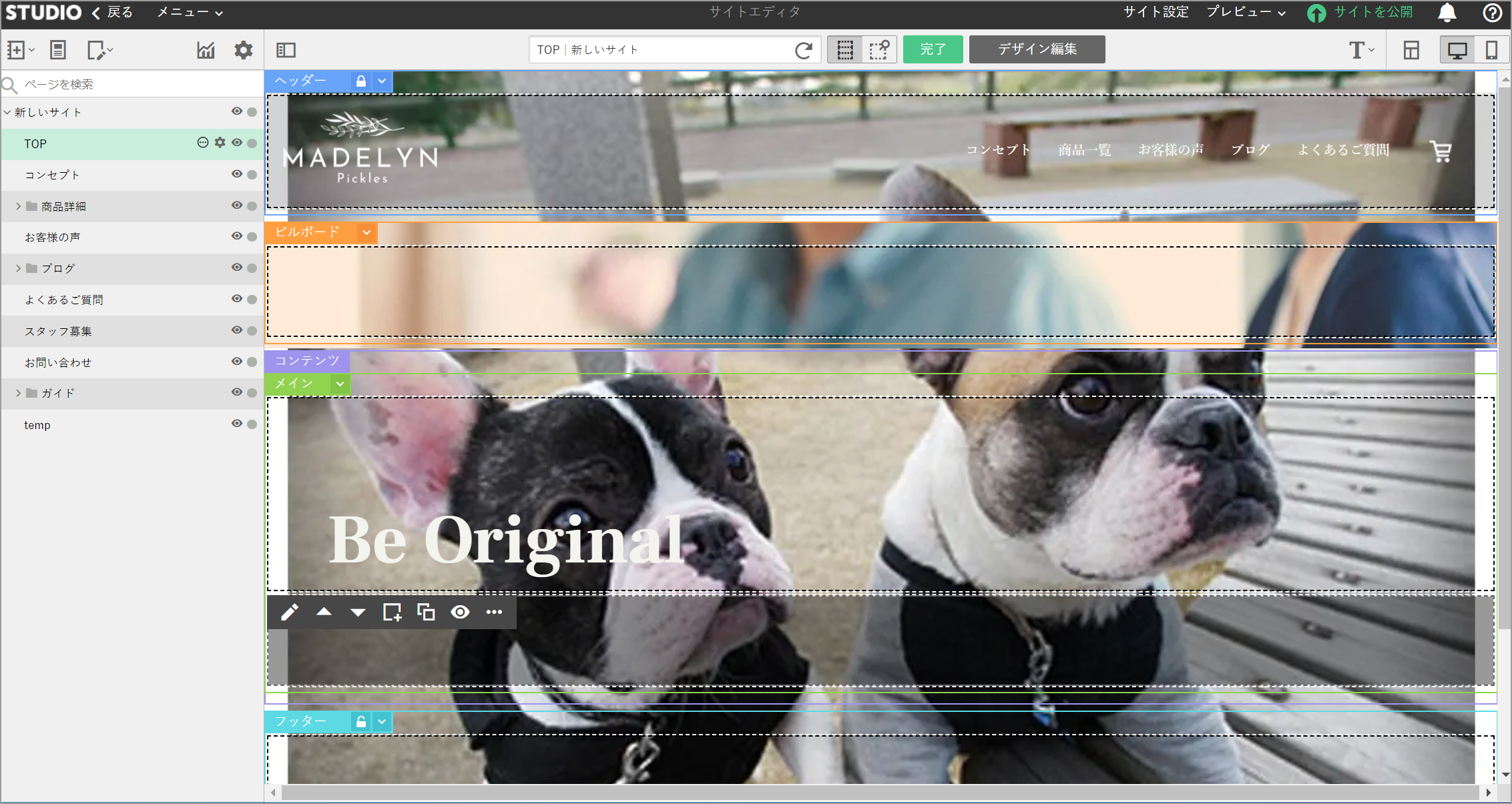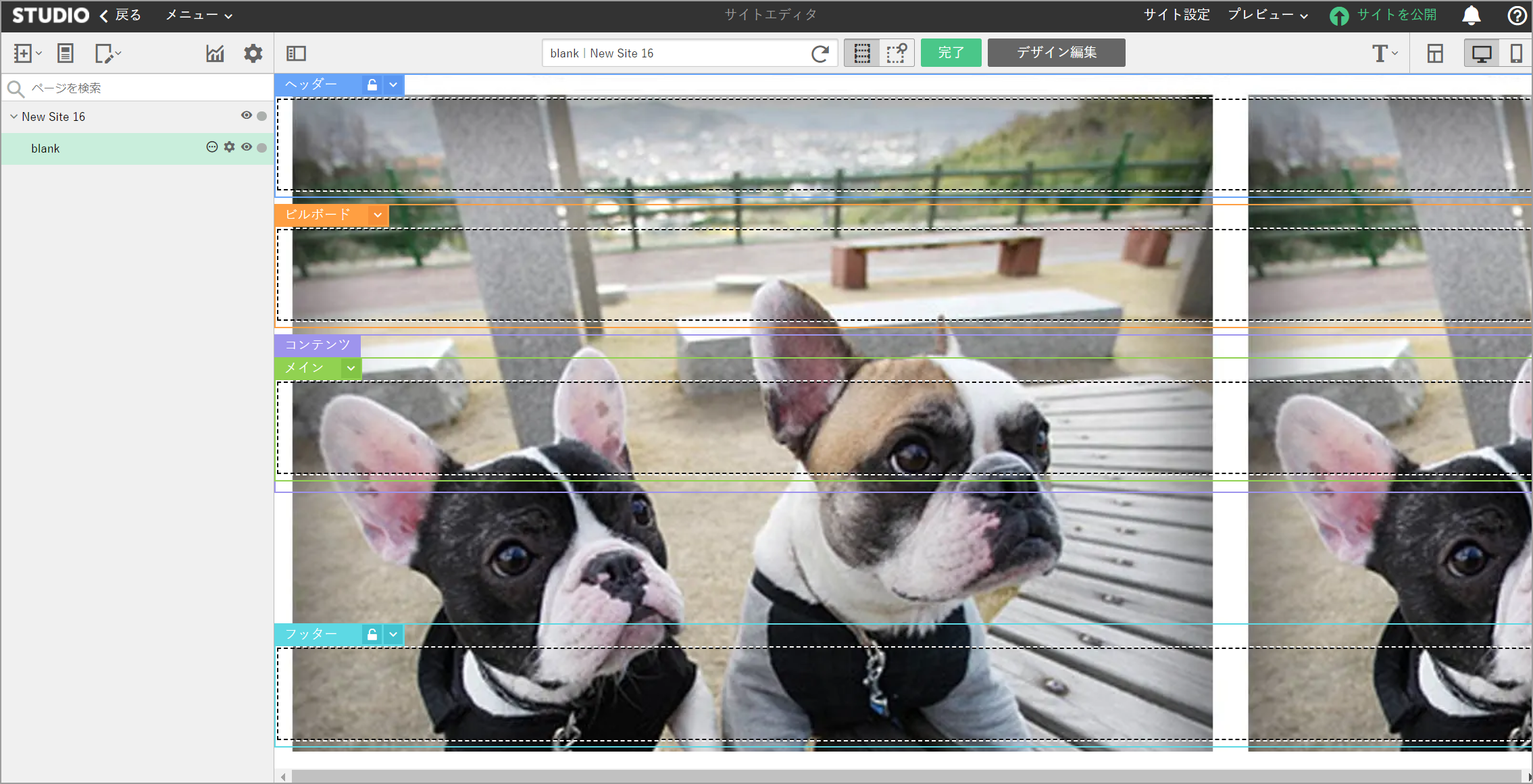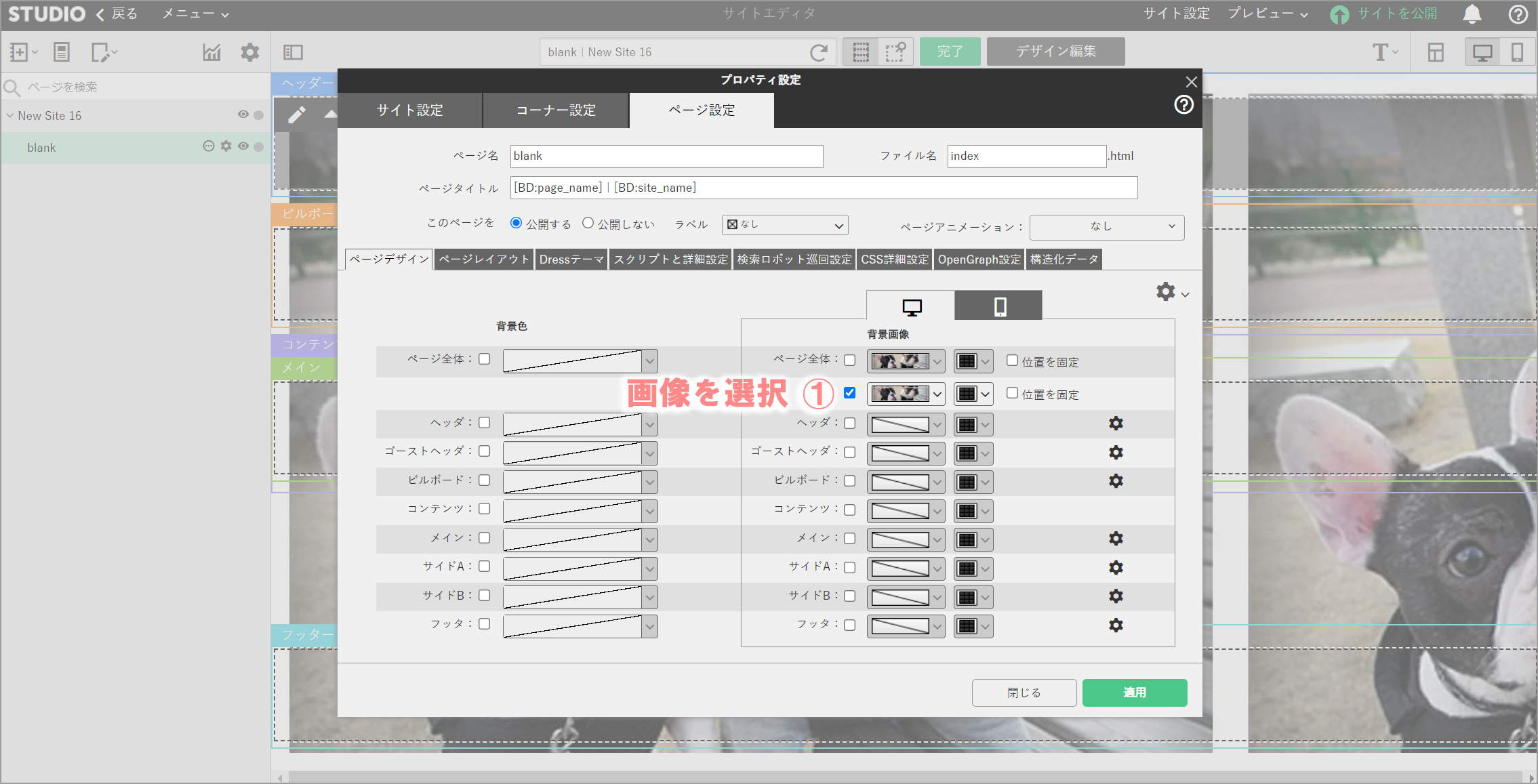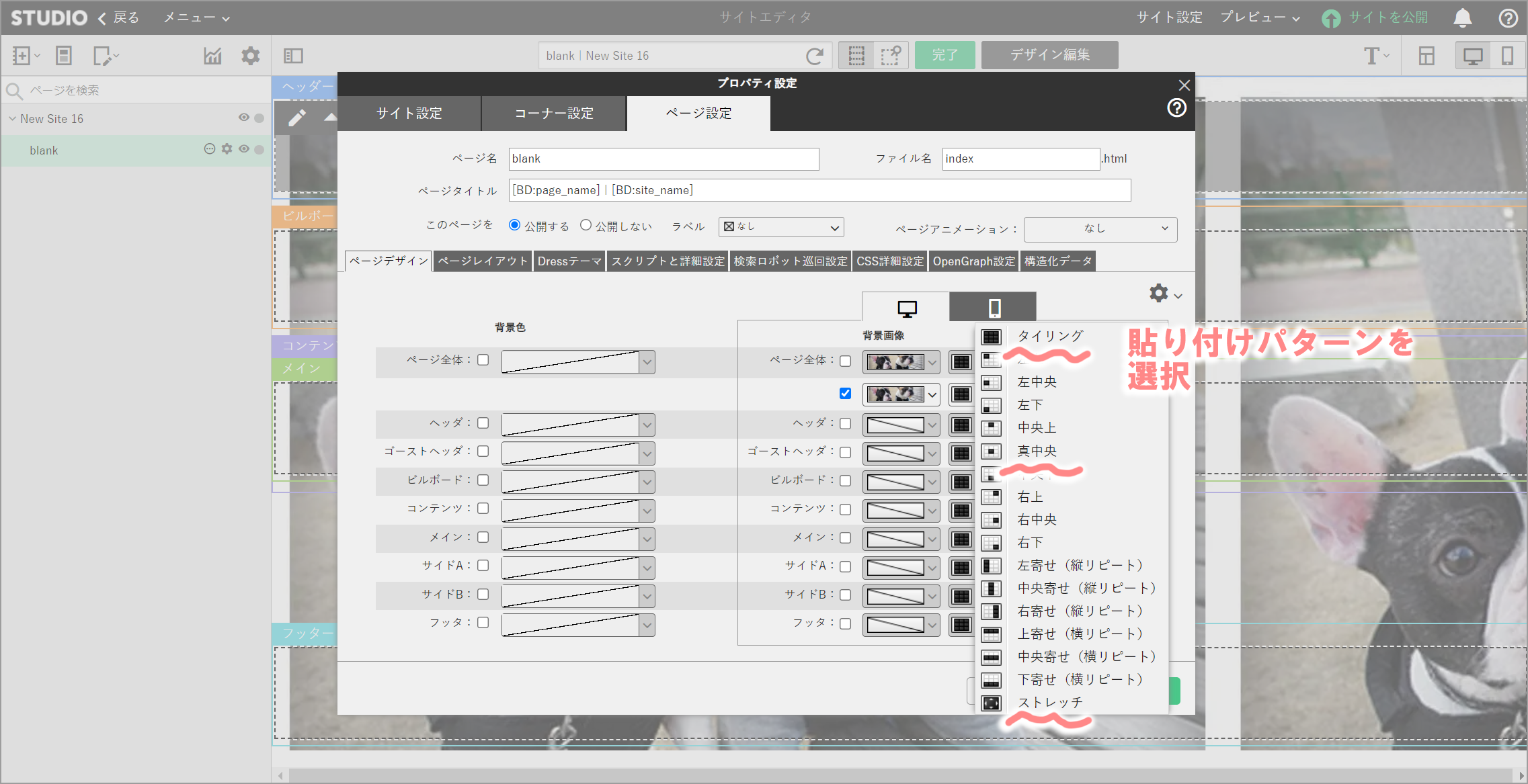 今回の背景画像に貼り付けは、各ブロックの背景では無く、ページ全体の背景です。ご注意下さい。(サンプル画像参照)