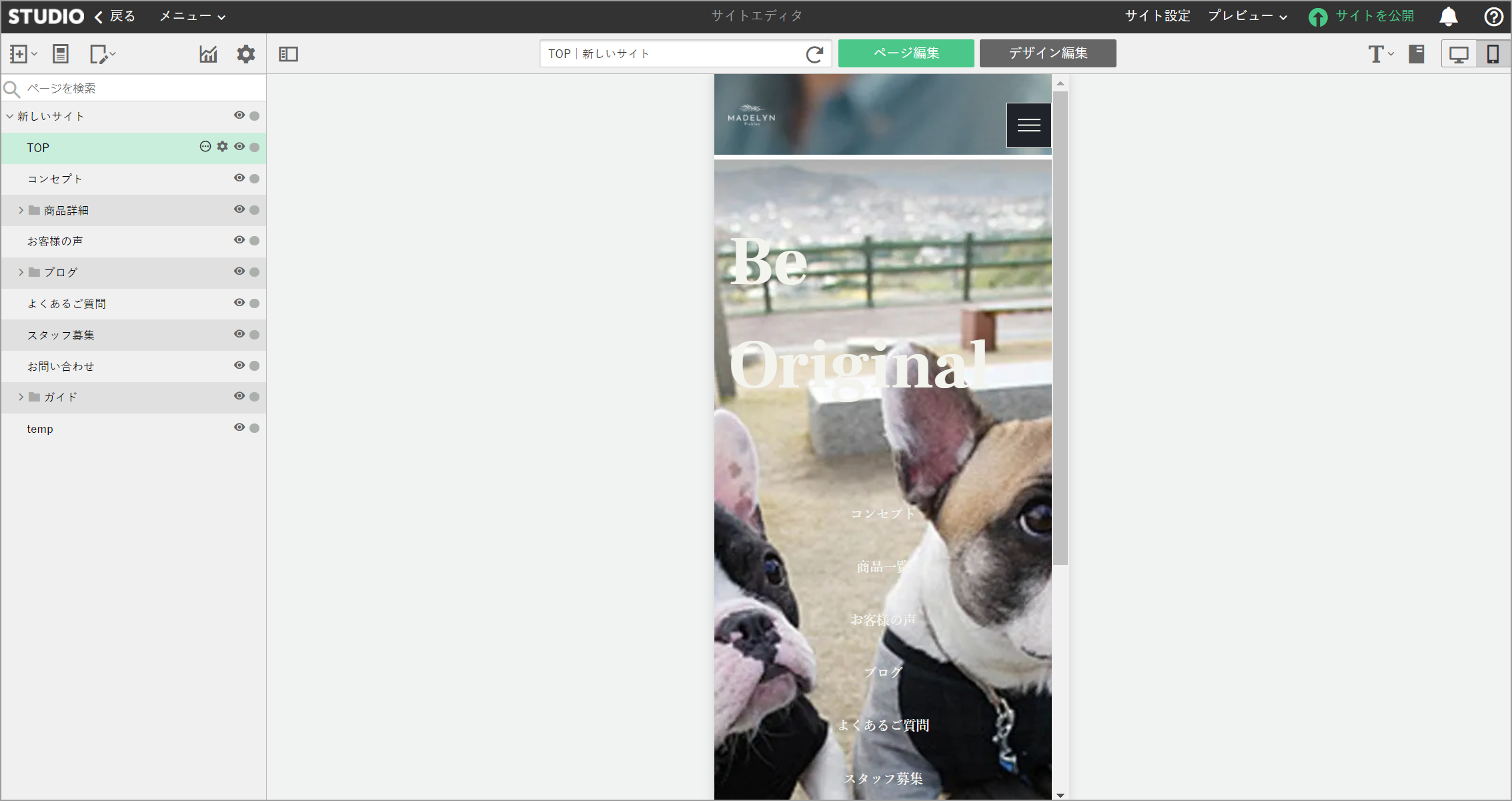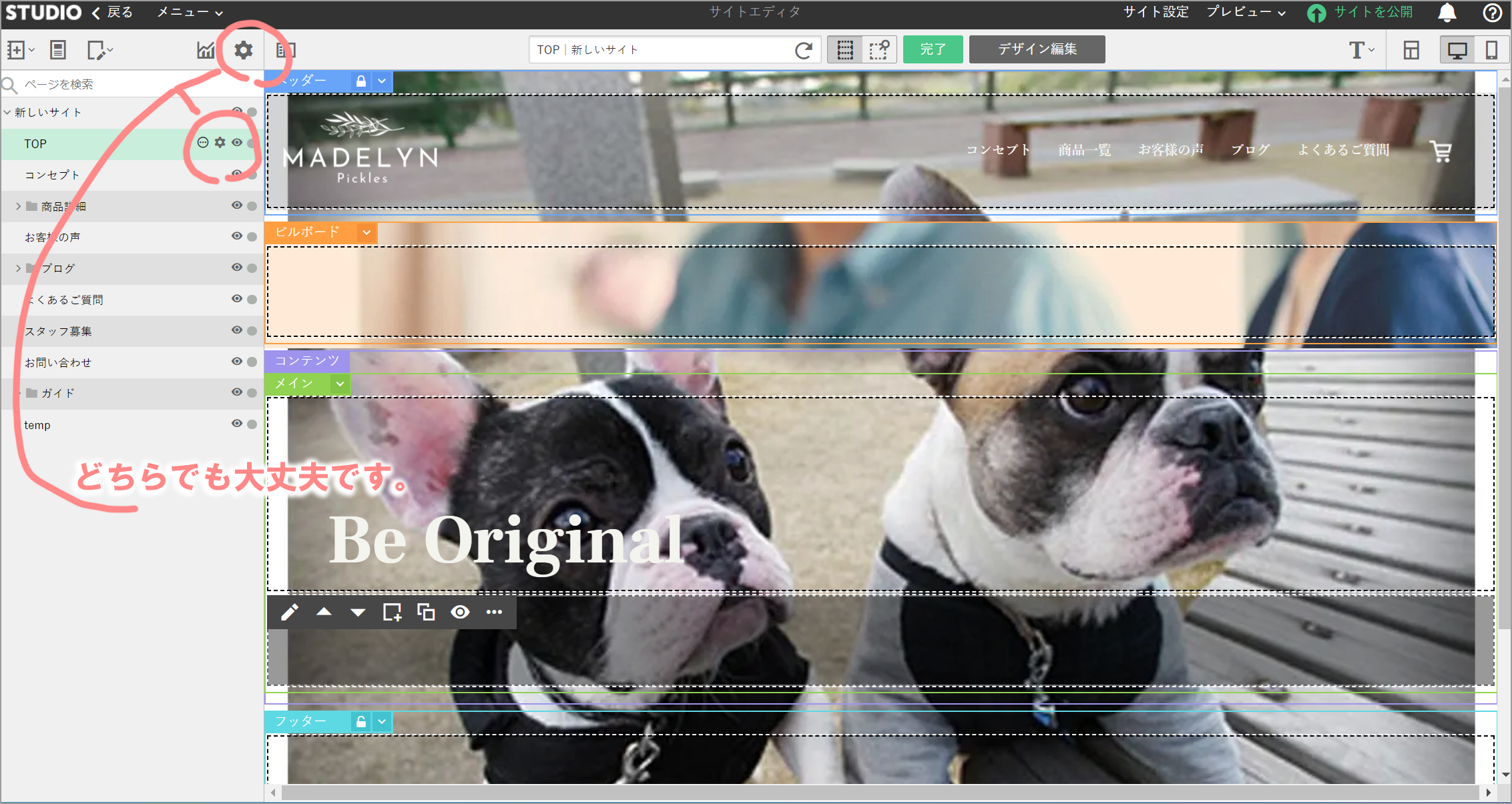 まず、変更したいページを表示して、歯車マークをクリックします。