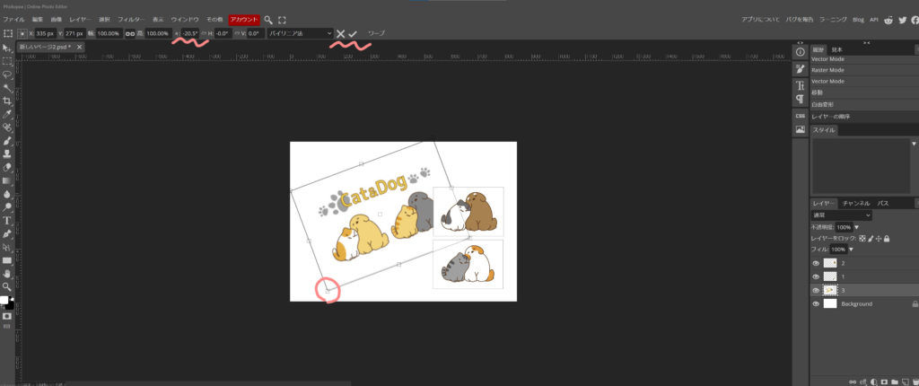 写真の四隅に、カーソル(矢印)を持って行くと、回転しそうなマークが出ます。後は、右クリックしたままで、回転させます。良い感じなら、上のレ点をクリック、直したい場合は、✖印をクリックすると、元に戻ります。
