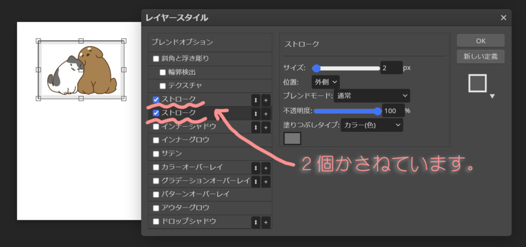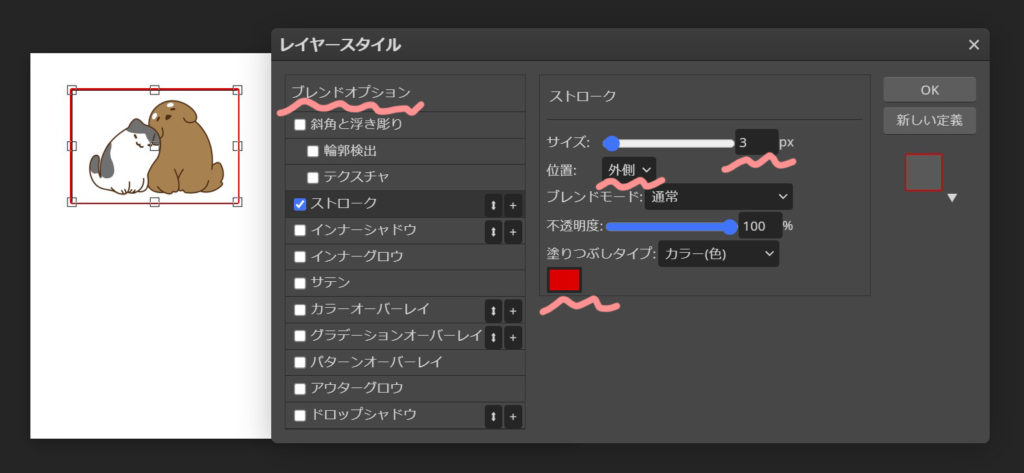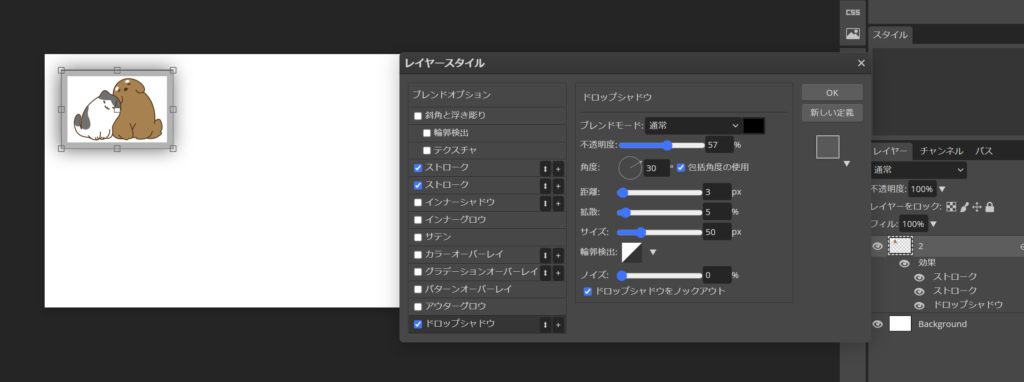 (因みにストロークはフォトショップでは境界線、ドロップシャドウは、同じ名前です)