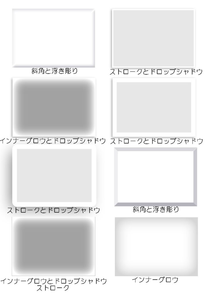 ドロップシャドウとインナーグロウ(フォトショップでは光彩の内側・外側)は、良く似た効果ですが、ドロップシャドウは、影が落ちた状態を作っているので、周囲に均等に効果が出ません。
