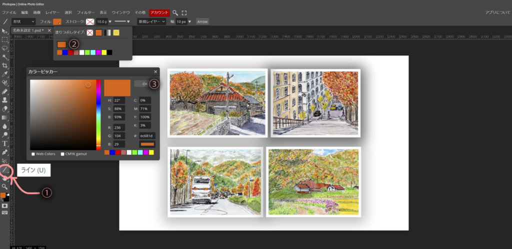 - 塗りつぶしタイプの②部分をクリックすると、カラーピッカーが出ます。