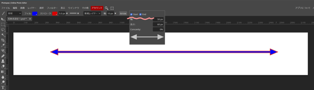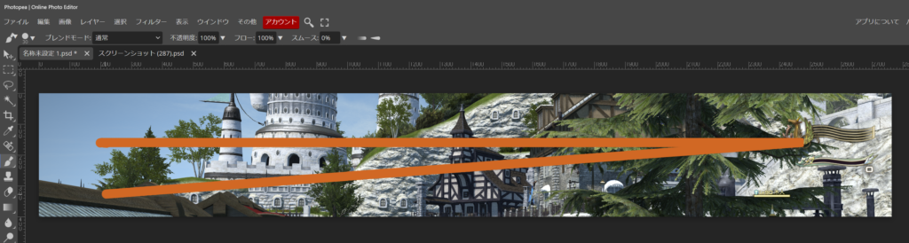 シェイプは、最初の位置を決めて、動かし始めると水平にしてくれましたが、ペンツールでは、最初の位置で1回クリックしてもう一度同じ所から、shiftボタンを押しながら、動かす感じです。直に書き込んでいますから、やり直しは、上段の編集から、やり直しを選択します。