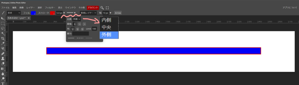 更に、ストロークを見て行きます。ストロークを変更する事で、シェイプの周りに枠線を作る事が出来ます。枠線の位置も、外側・中央・内側に選択可能ですし、角も丸くする事が出来るので、楕円形のシェイプも作れます。