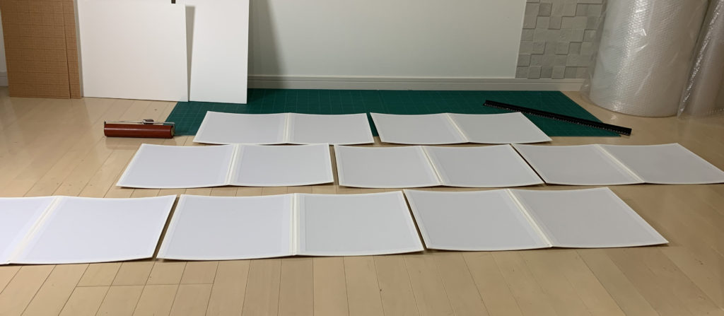 一つのグループは、到着した台紙を開封して、開いた状態で、スタジオに並べました。除湿状態のエアコンの掛かった部屋に放置しました。