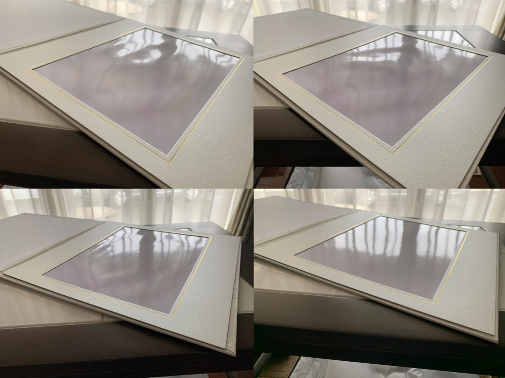 一見して、レザー台紙の方が高級に見え(実際に単価も高いです)、段々そちらの方に移行していった気がします。勿論、お客様の反応もそちらの方が良かったのです。