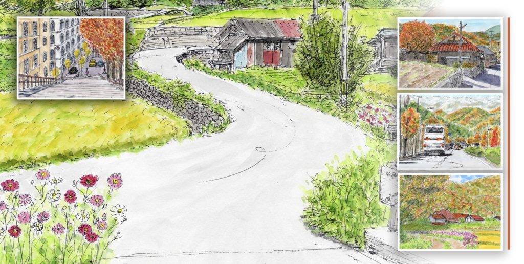 今回は、見開き2ページに大きく写真を使ったレイアウトをやってみます。左上の写真は、風景しかなかったので、まっすぐ置いていますが、ポートレートなどでしたら、少し斜めに置いても、良いと思っています。