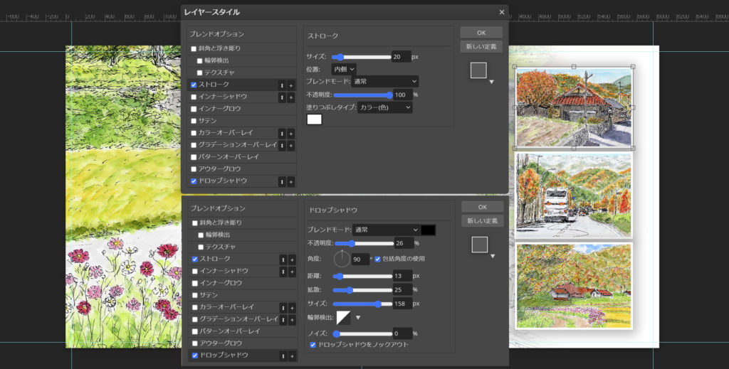グラデーションが出来たら、右側の3枚の写真を置いて行きます。今回のブレンドオプションは、ストロークとドロップシャドウを使いました。
