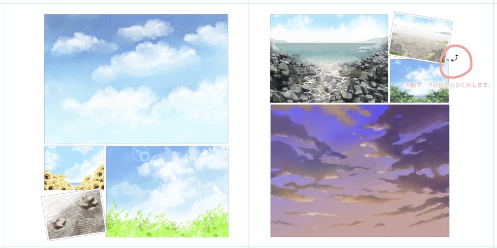 今回は、こんな感じに置いて見ました。写真の四隅にマウスカーソルを持って行き、回転マークに変ったら、少しだけ回します。行き過ぎたなと思ったら、上段の×マークで、元の位置に戻して、再度回転させます。