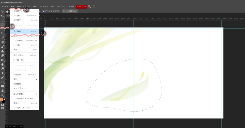 ①編集から ②コピーを選択 ③最後に台紙上でペーストします。