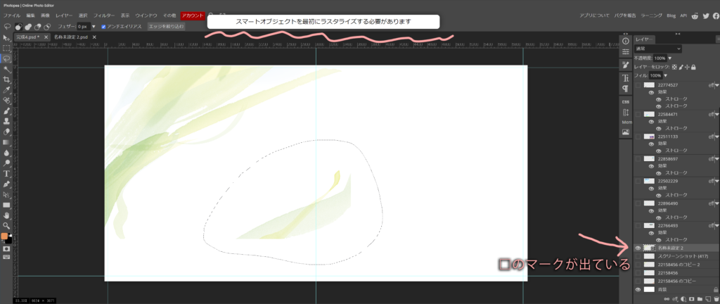 □が出ているレイヤー上で、右クリックして、ラスタライズを実行です。