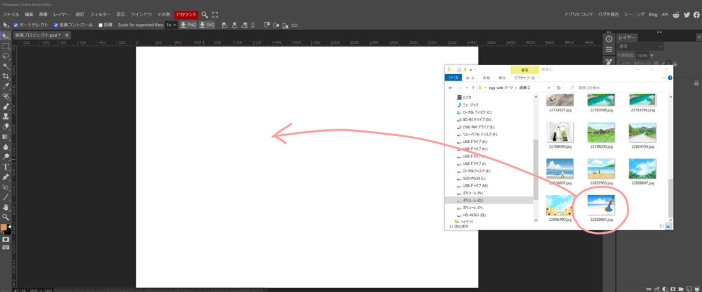 エクスプローラーから、写真を乗せます。今回は、写真の周囲が白く、切り取った感じが分かり難いので、ブレンドオプションで、ハッキリさせました。