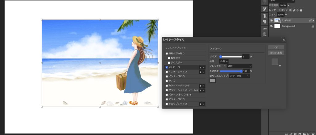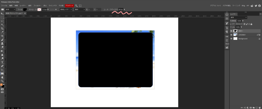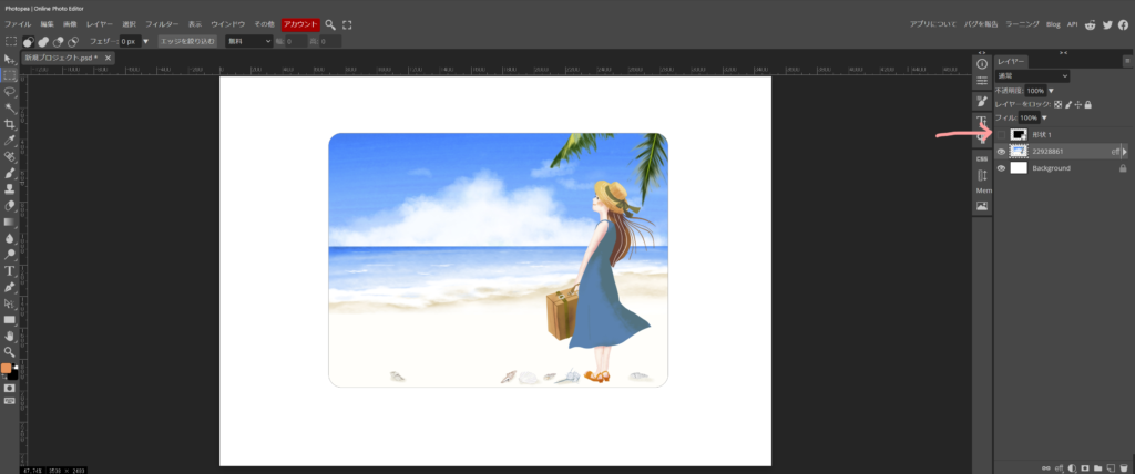 大きさ合わせの黒枠を非表示(目玉マークをクリック)にするか、削除したら、角丸写真の完成です。