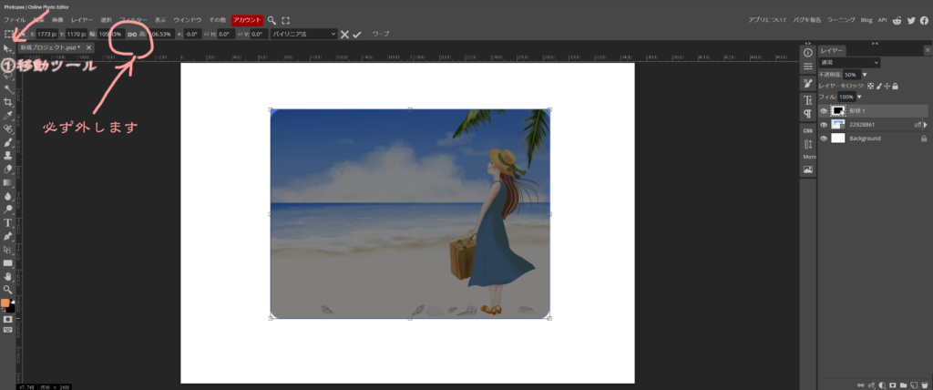 移動ツール選択して、小さい□にカーソルを合わせて、サイズ調整しますが、必ず、上の鎖マークに色が着いていない事を確認します。そうしないと、上下左右を別々に、調整出来ません。