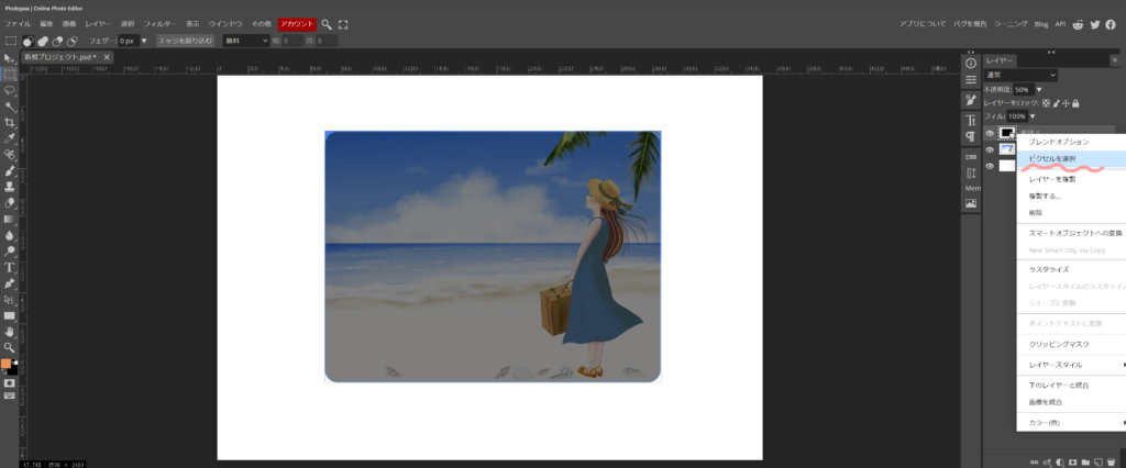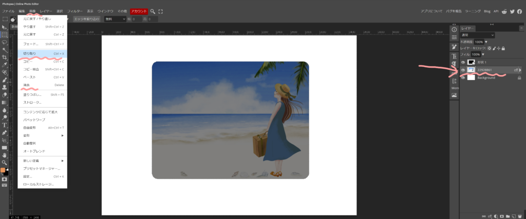 角丸にするレイヤーを選択したら、上段の画像から、切り取り(消去でも大丈夫です)をクリックします。