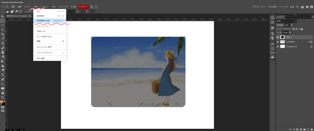 続いて、上の黒枠を、半透明(不透明度50%)にします。数字は、適当で下の写真が見えれば大丈夫です。これで、下に有る写真を切り取る作業時に、大きさの比較がし易くなります。
