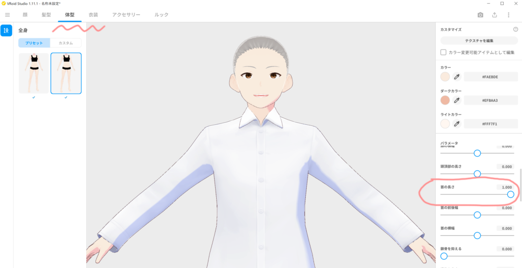 シャツを着ますと、首が短く見えましたので、体形から、首の長さを、調整しました。