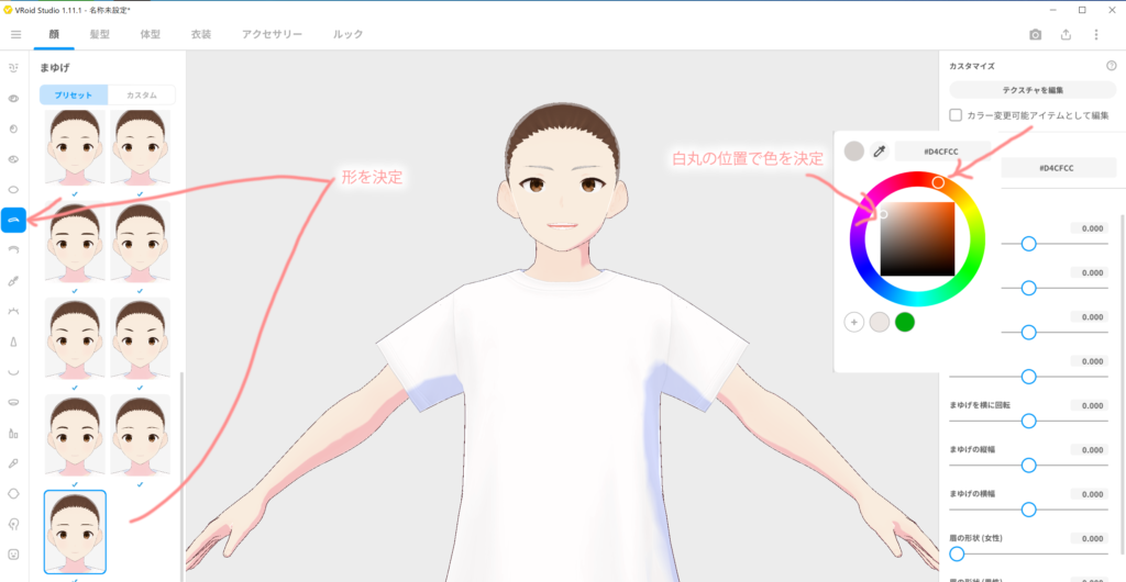 続いて、私は、眉毛の色と形を変更しました。右側のスライダーで、さらに細かく設定出来ますので、お好みで調整してみて下さい。