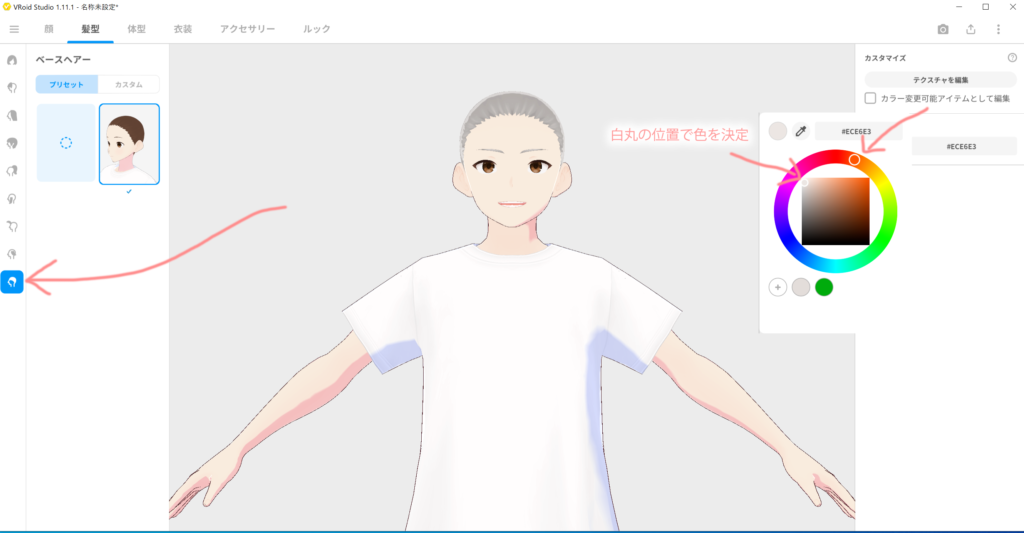 次が、髪の色です。私は、短髪ですのでこのままでしたが、ヘアースタイルも沢山、選択肢がお好みで選択して下さい。