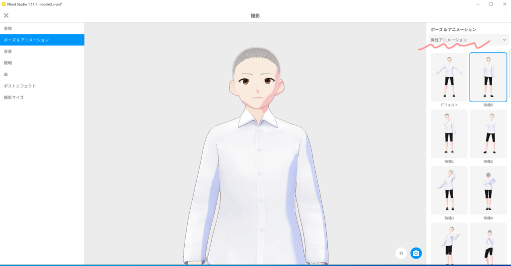 カメラモードに移行しますと、先程、設定したお顔の表情は維持されていない様で、もう一度、設定する必要が有る様です。基本的なポーズを、変更します。