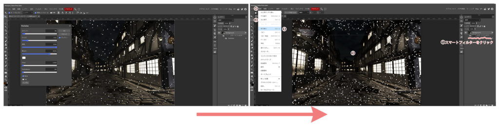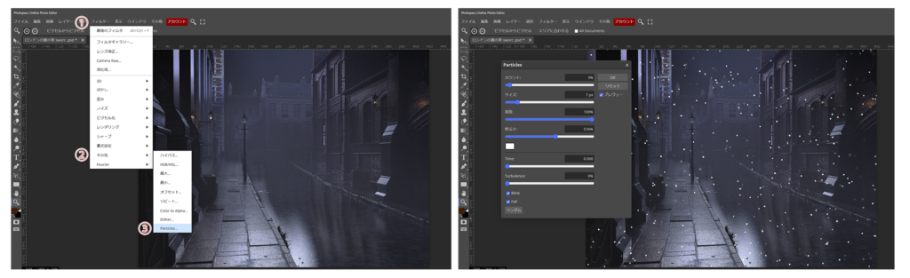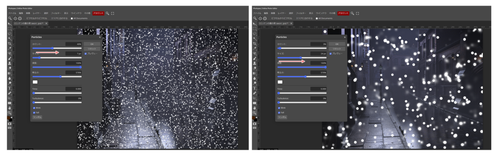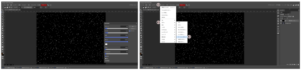 JPG画像の状態でも、particleの効果は使えますが、一度やってしまうと変更が出来ません。