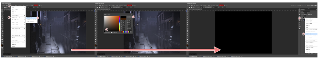レイヤーにフィルター効果が着けれるように、⑥黒いレイヤーを選択して、⑦ラスタライズします。