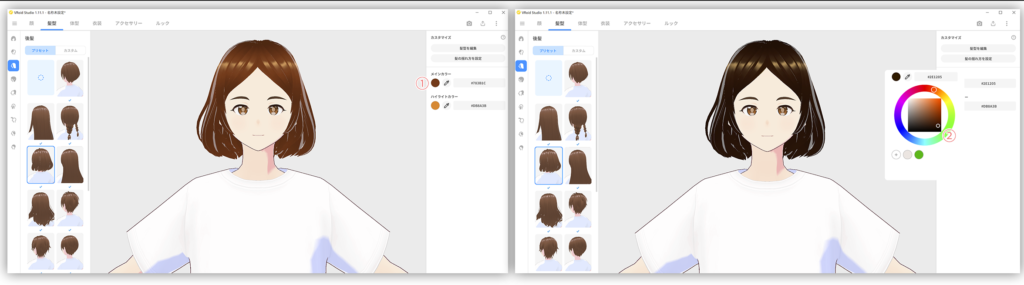 ①メインカラーを左クリックすると、ピッカーが出ますので、今回のモデルさんは、黒に近い髪色でしたので、変えてみました。