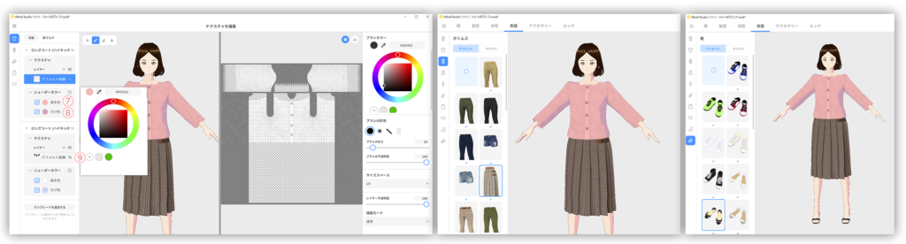 ⑦白のブラウスだったので、基本色と影の色を調整して、⑨必ず、ハイネックレイヤーを非表示(目玉が斜線のマークが点灯状態)にします。
