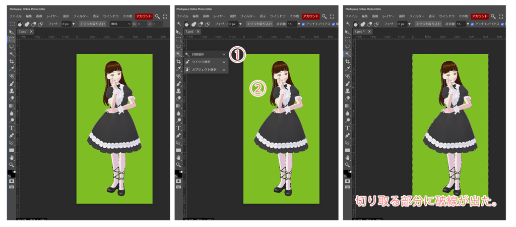 先ず、アバターの画像を開きます。続いて、①自動選択を選びます(ツールが分かり難い時は、マークを左クリックすると、上の様な表示が出ます^^。)②切り取りたい場所を。左クリックします。