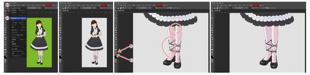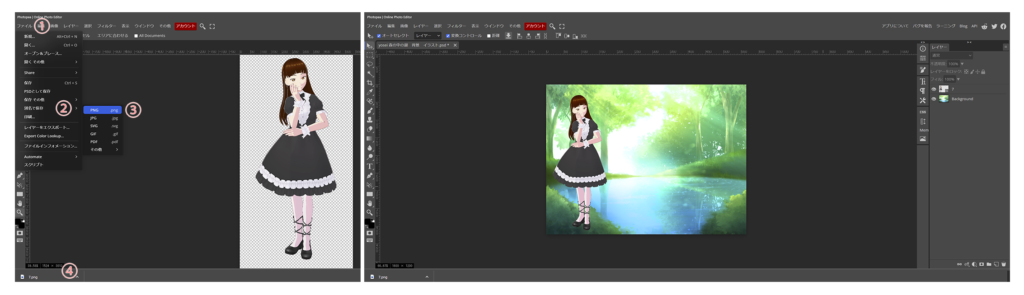 ①上段のファイルから、②別名で保存、③PNGと進みます。周りを切り取った画像は、必ずPNGで保存して下さい。④切り取ったPNG画像がダウンロードされているはずです。