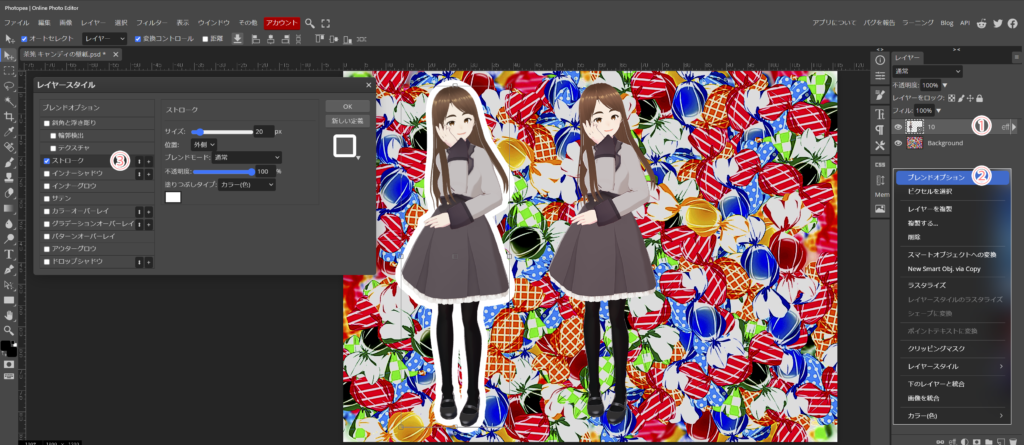 ①効果を着けたいレイヤーを、右クリック、②ブレンドオプションを選択します。