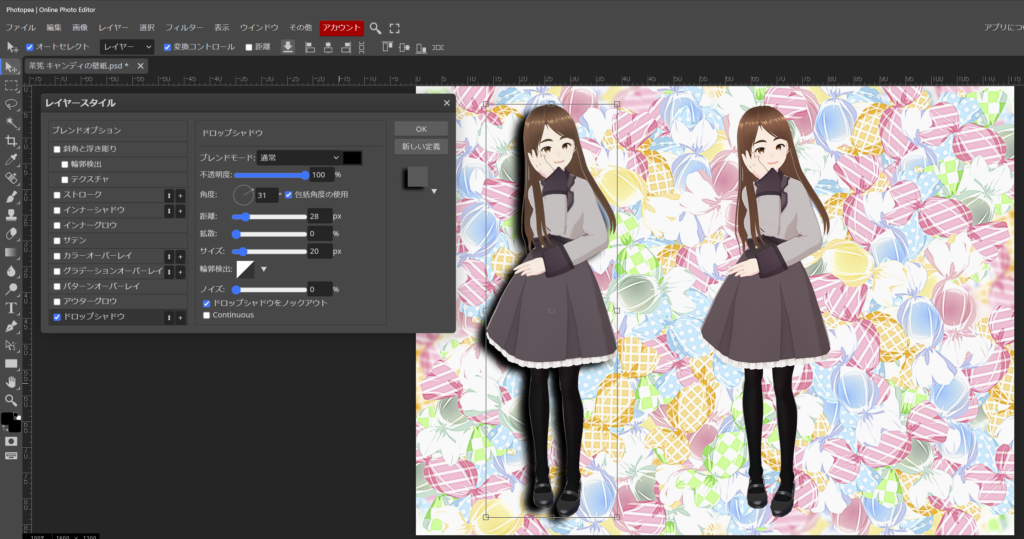 次は、ドロップシャドウです。斜めに影が出るのが特徴です。影の色、角度、距離などが変更出来ますので、お好みでご使用下さい。