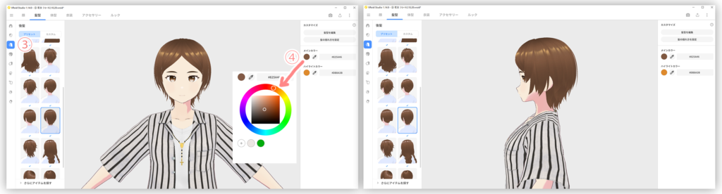 続いて,③後ろ髪を確定しました。④から、髪の色を変更出来ます。メインカラーの、色の付いた○印をクリックすると、カラーピッカーが出ますから、お好みのお色に、変更して下さい。