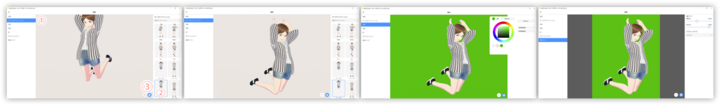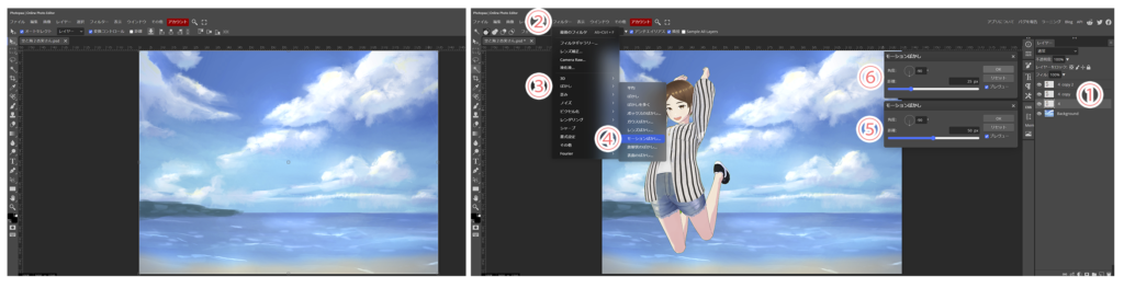 背景を、載せたら、①アバターのレイヤーを3枚作ります。必ず、下側のレイヤーに、②上段のフィルターから、③ぼかし、④モーションぼかしと進みます。