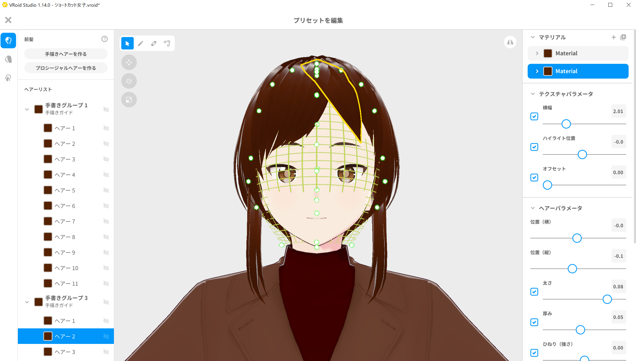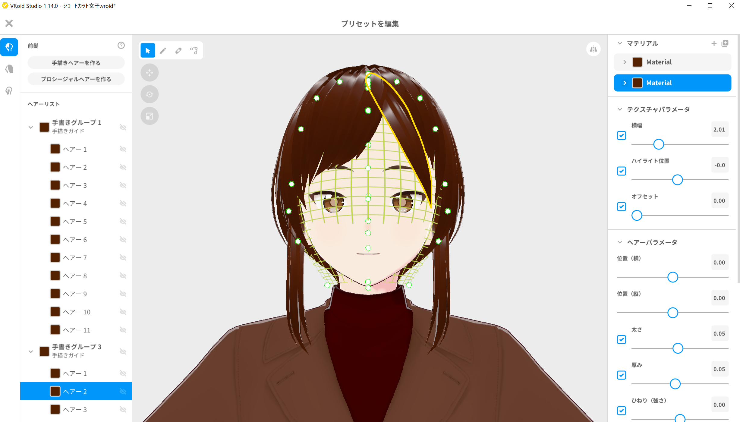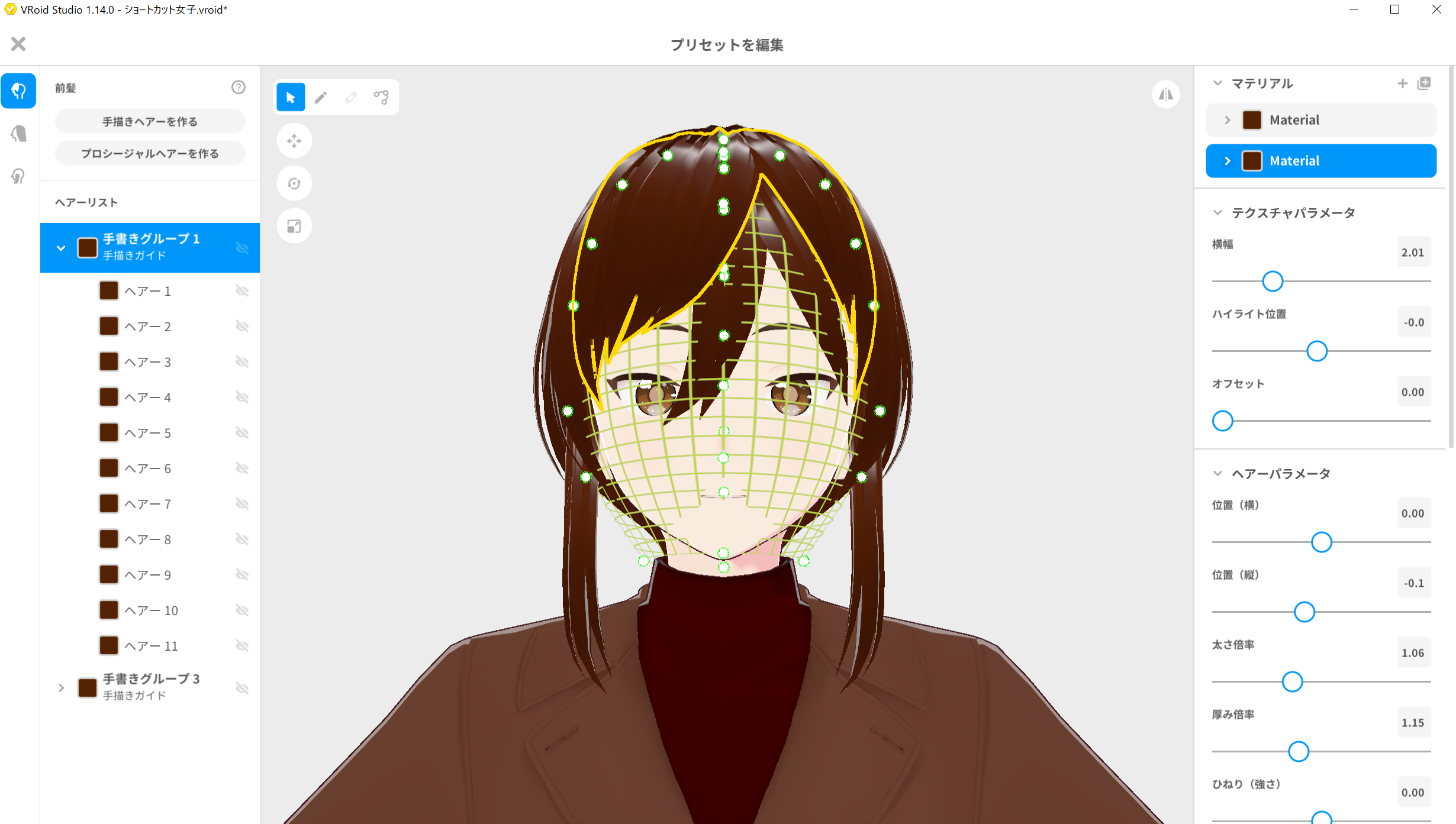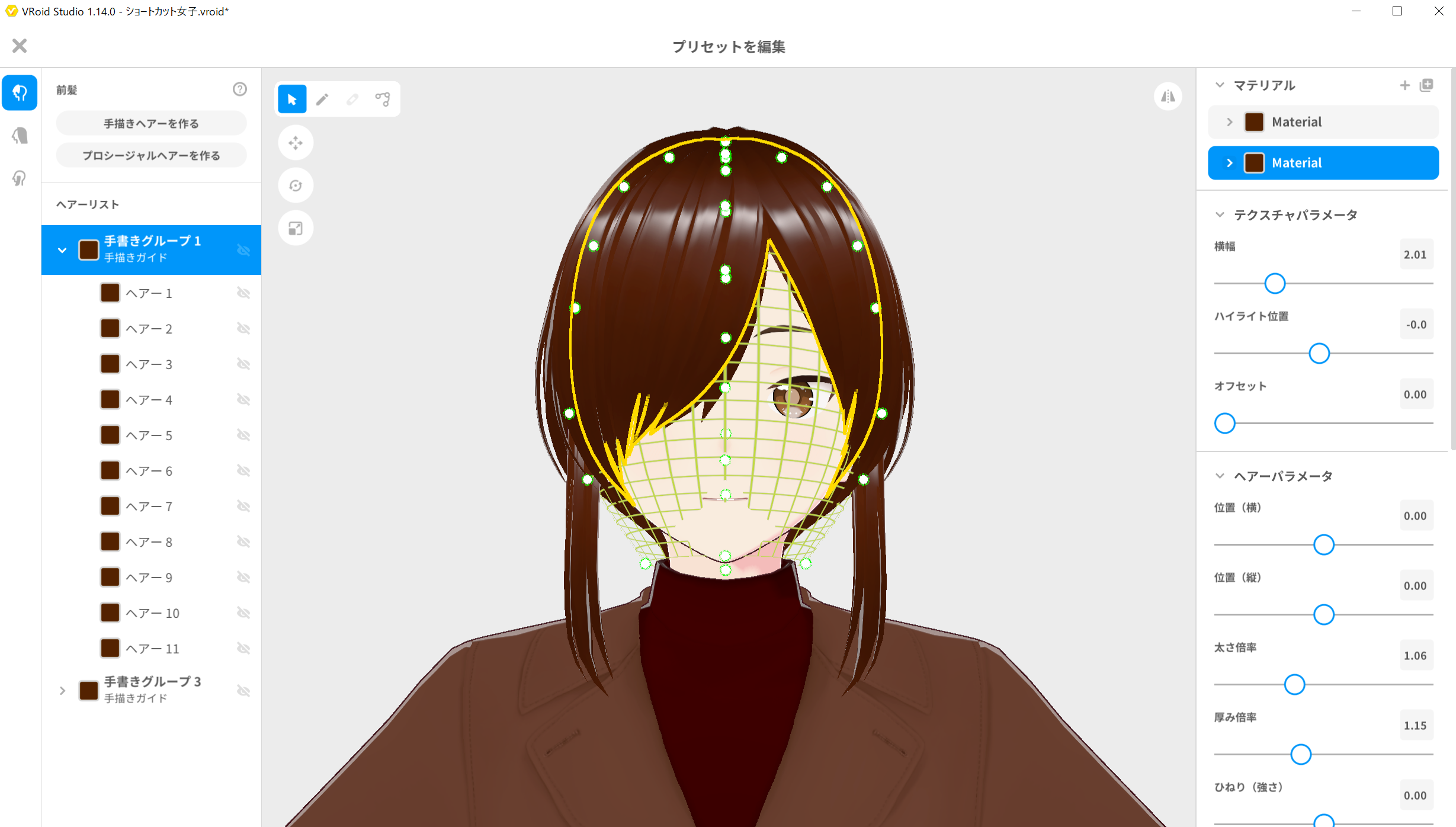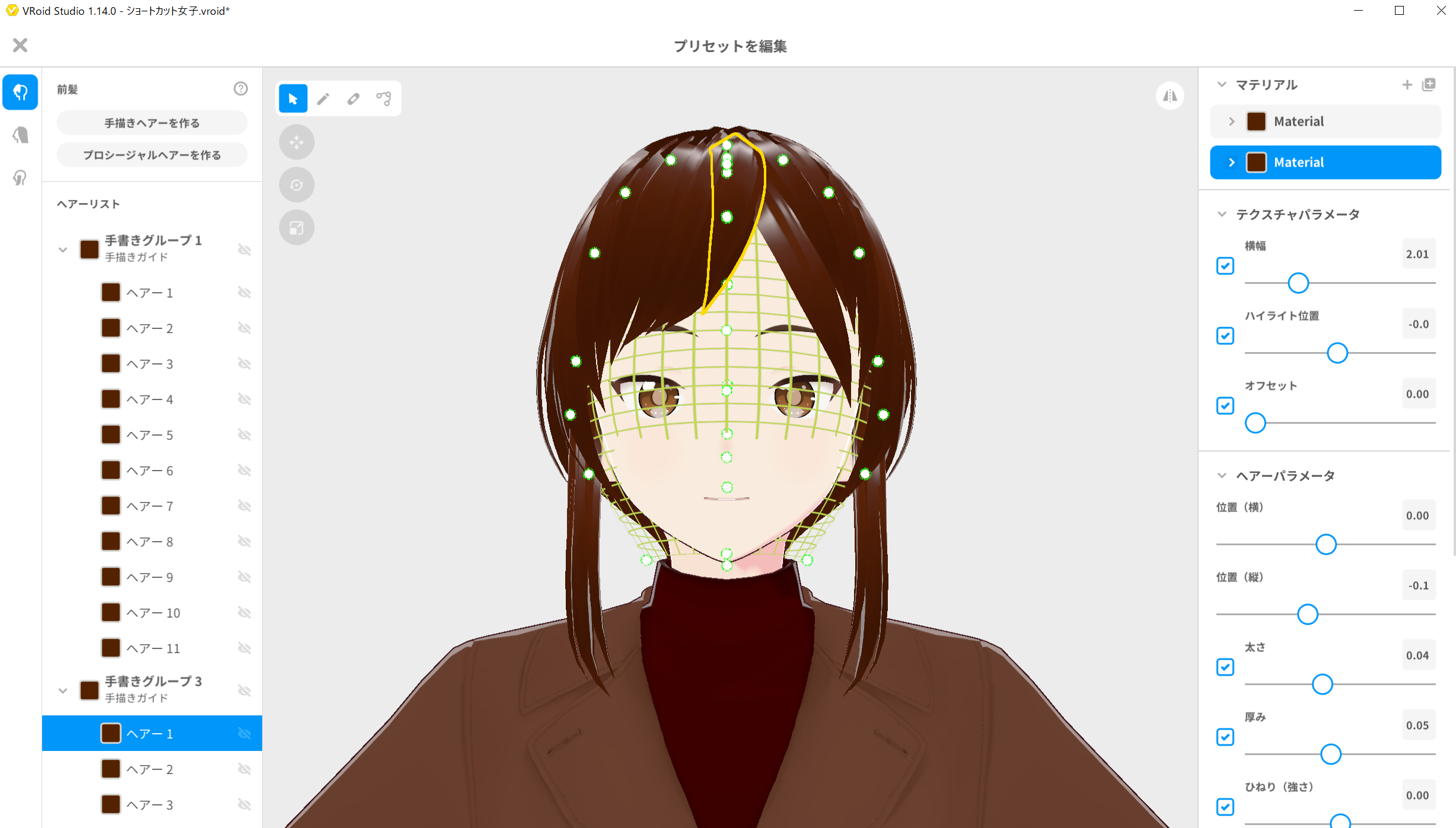 手書きグループ1を選択して、ヘアーパラメーターの位置(縦)のスライダーを左の動かしますと、髪が持ち上がりました。