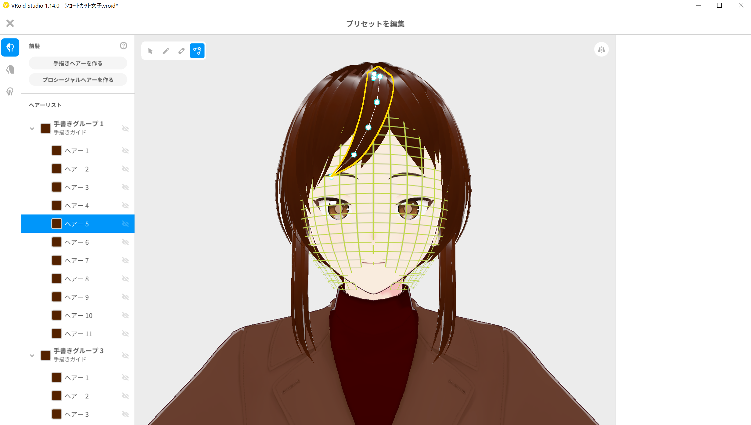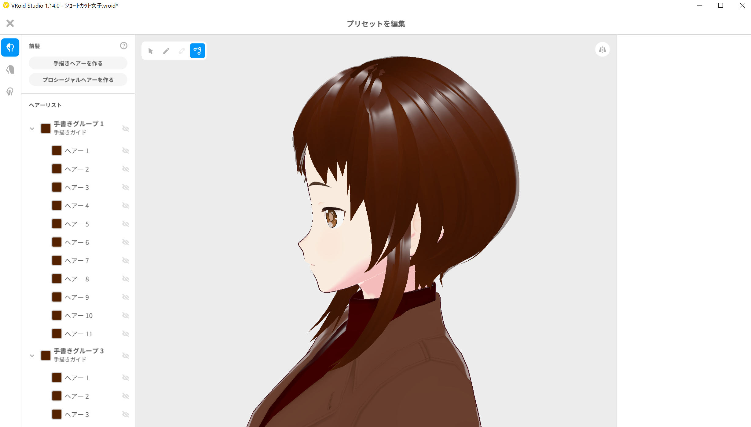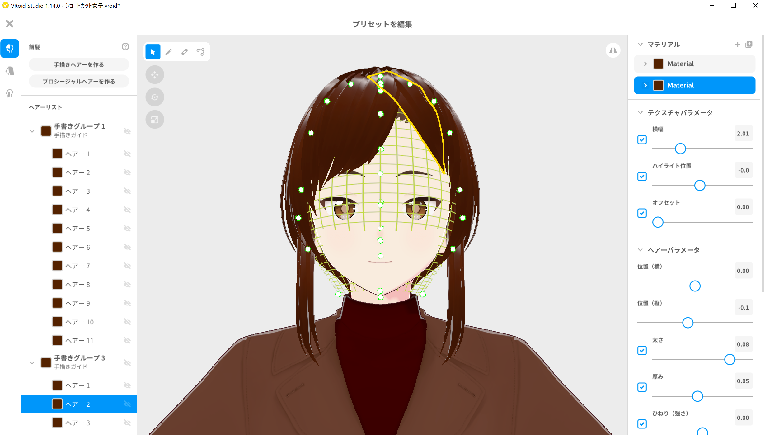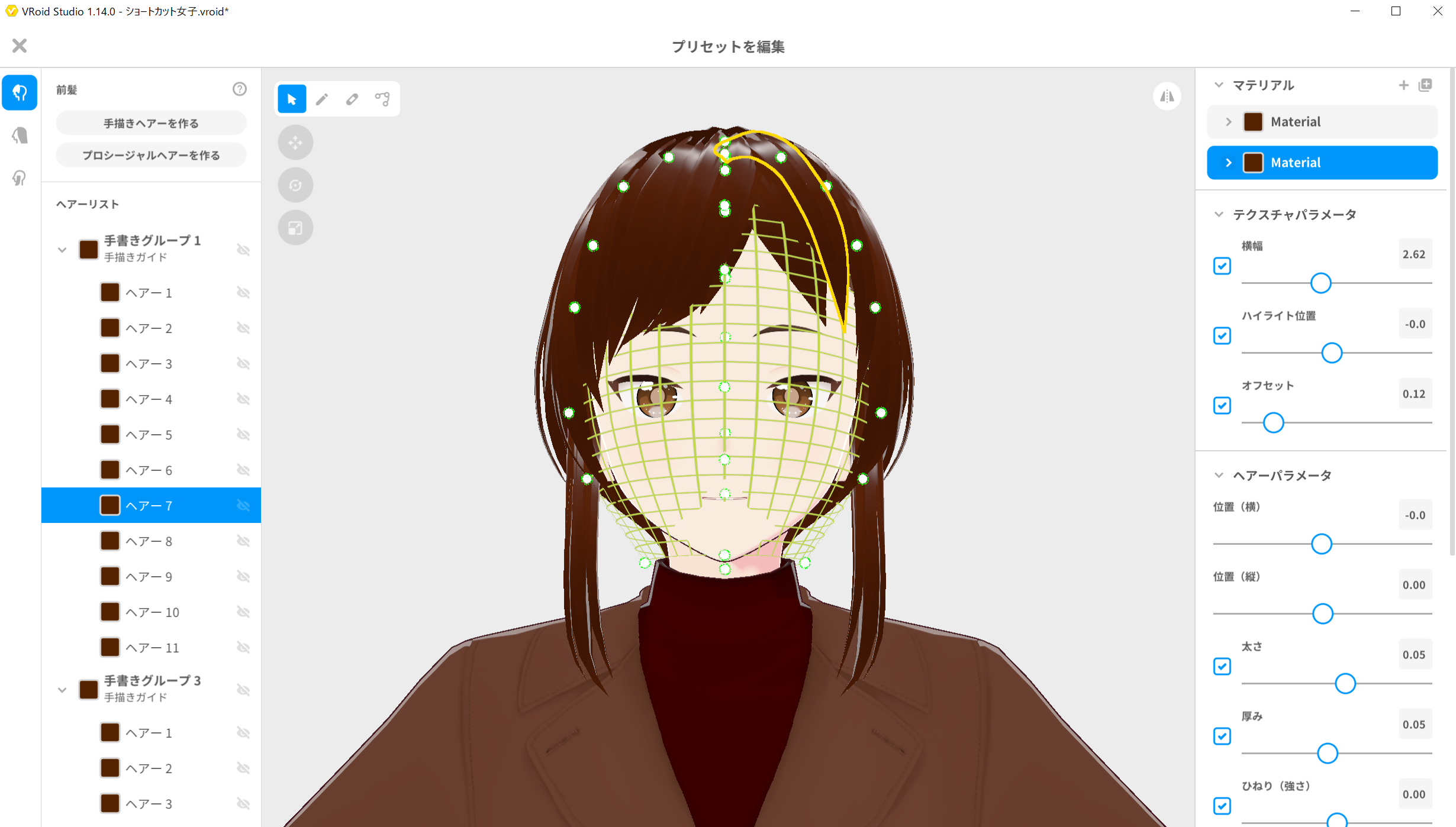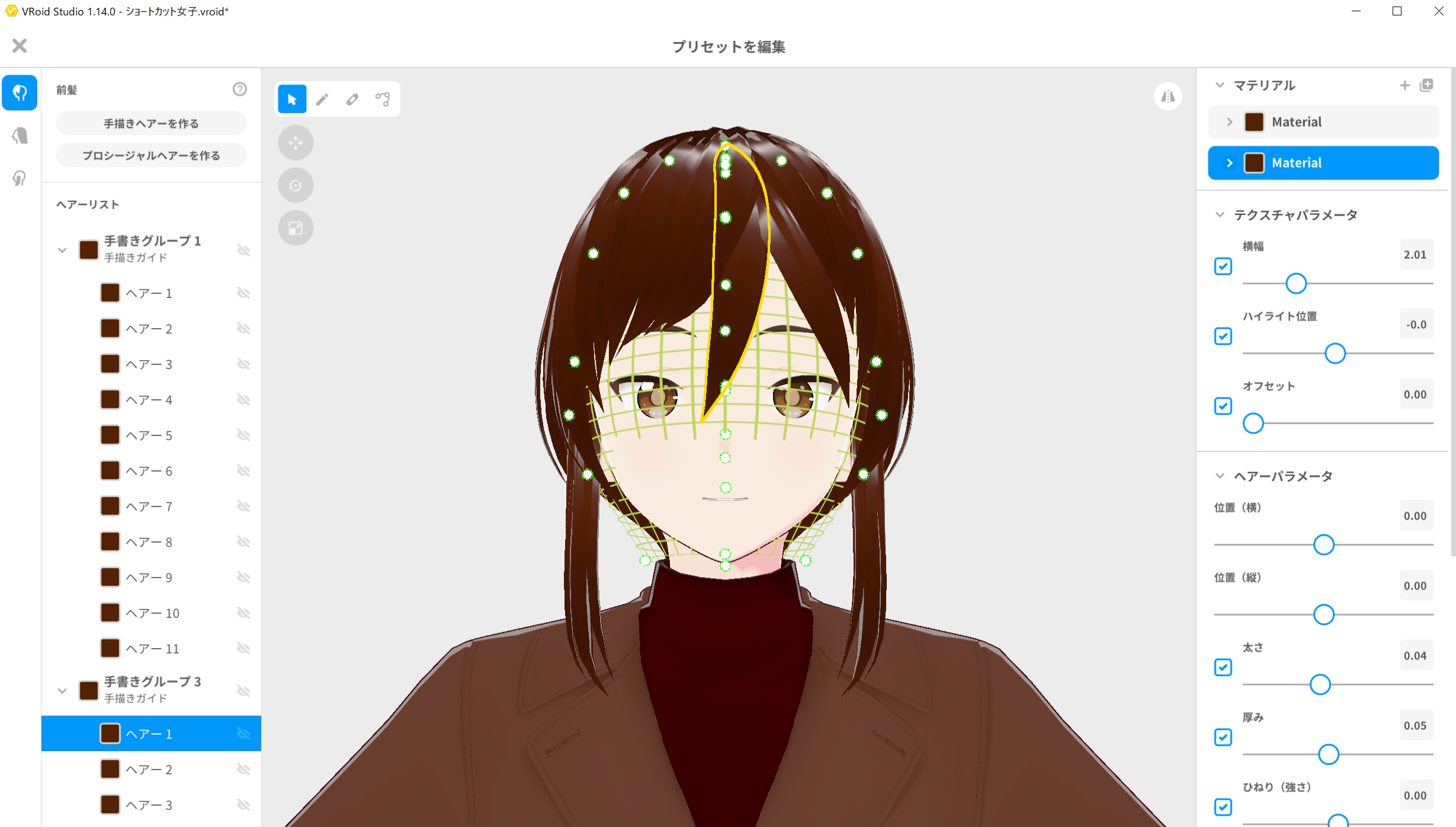 手書きグループ1を選択して、ヘアーパラメーターの位置(縦)のスライダーを左の動かしますと、髪が持ち上がりました。