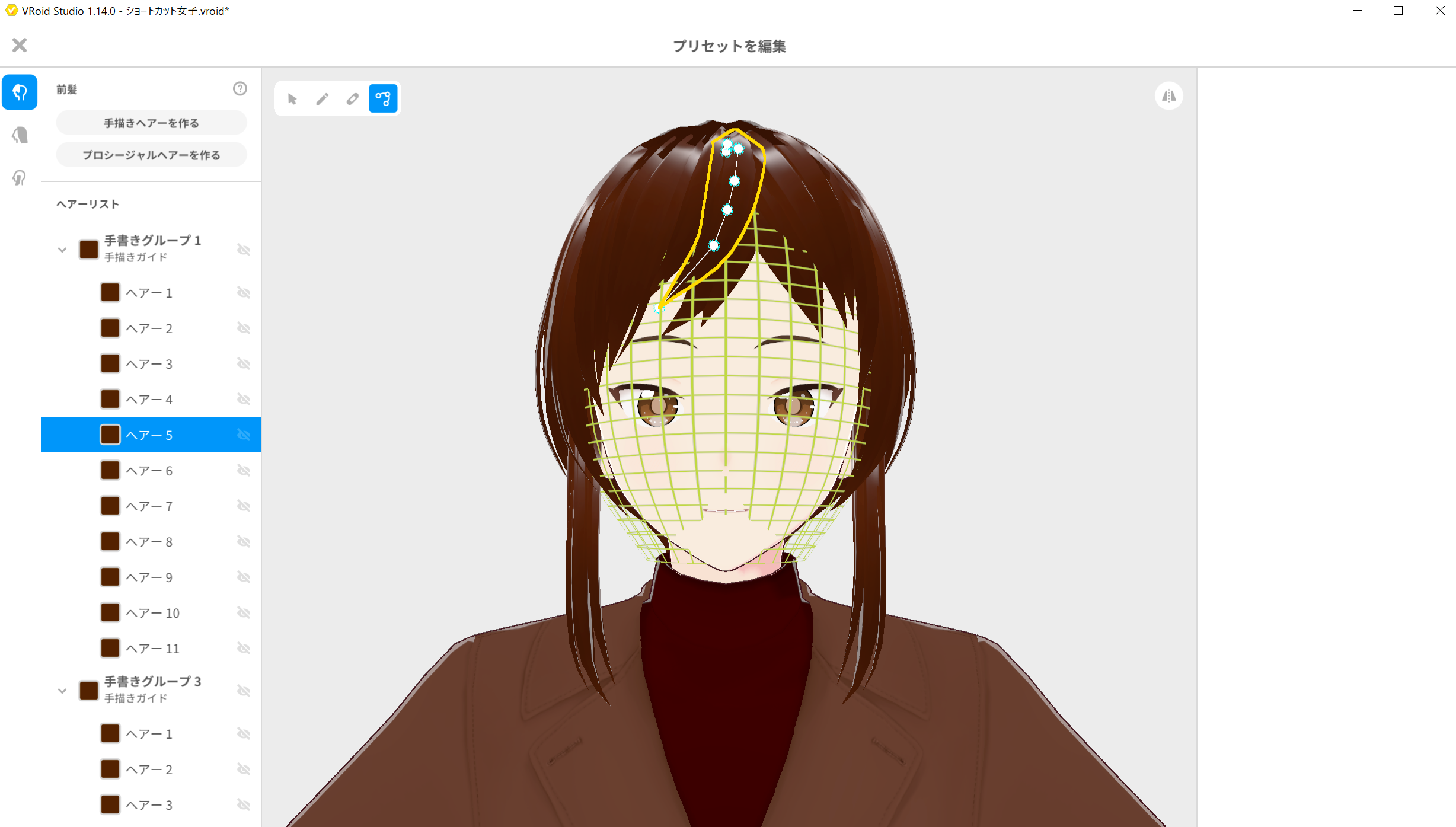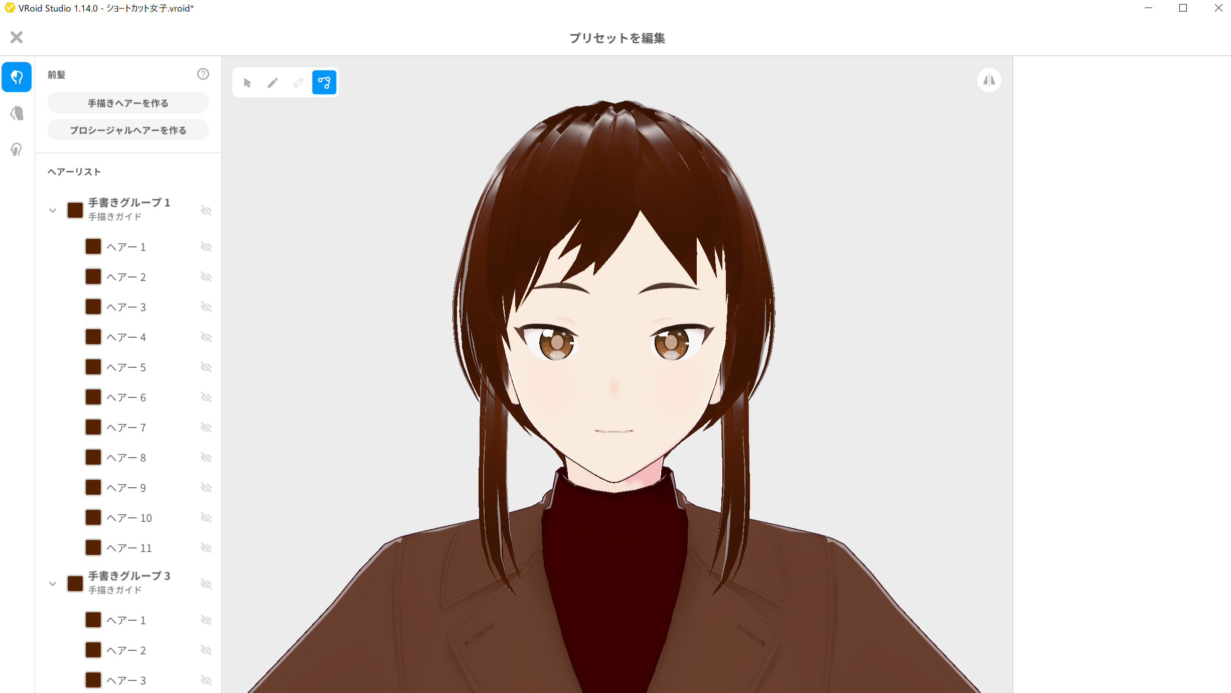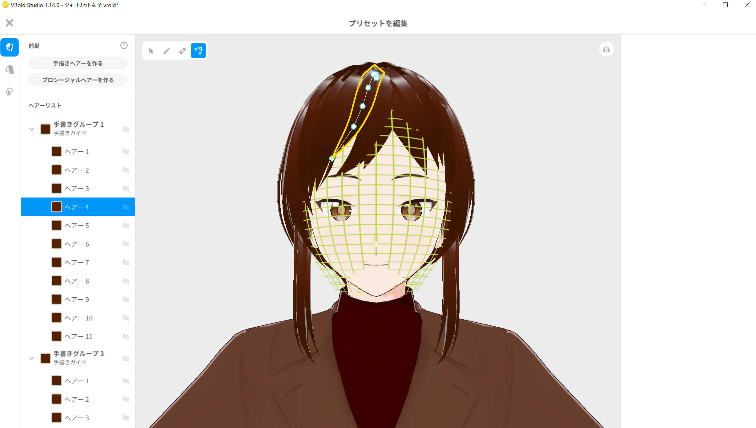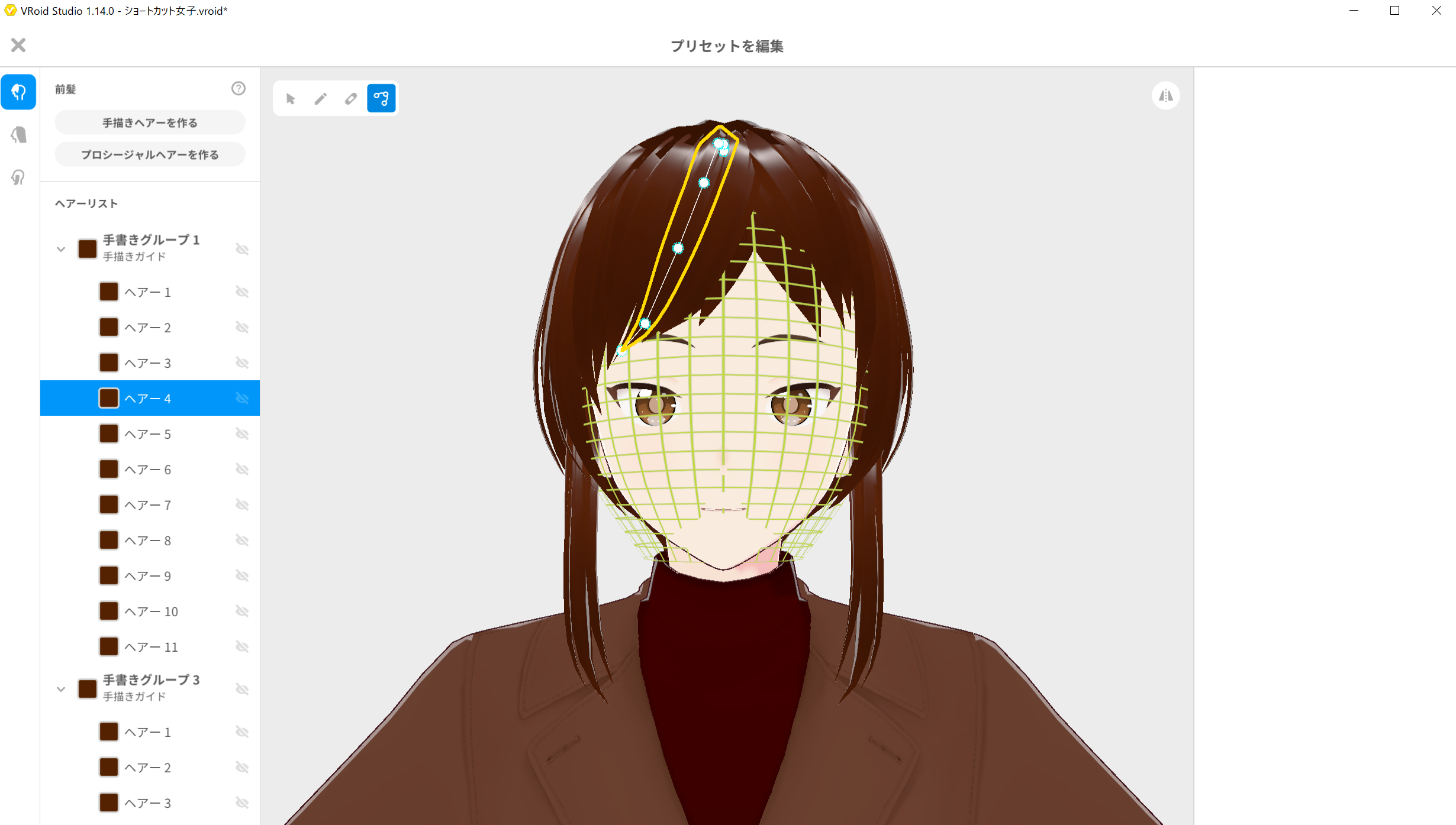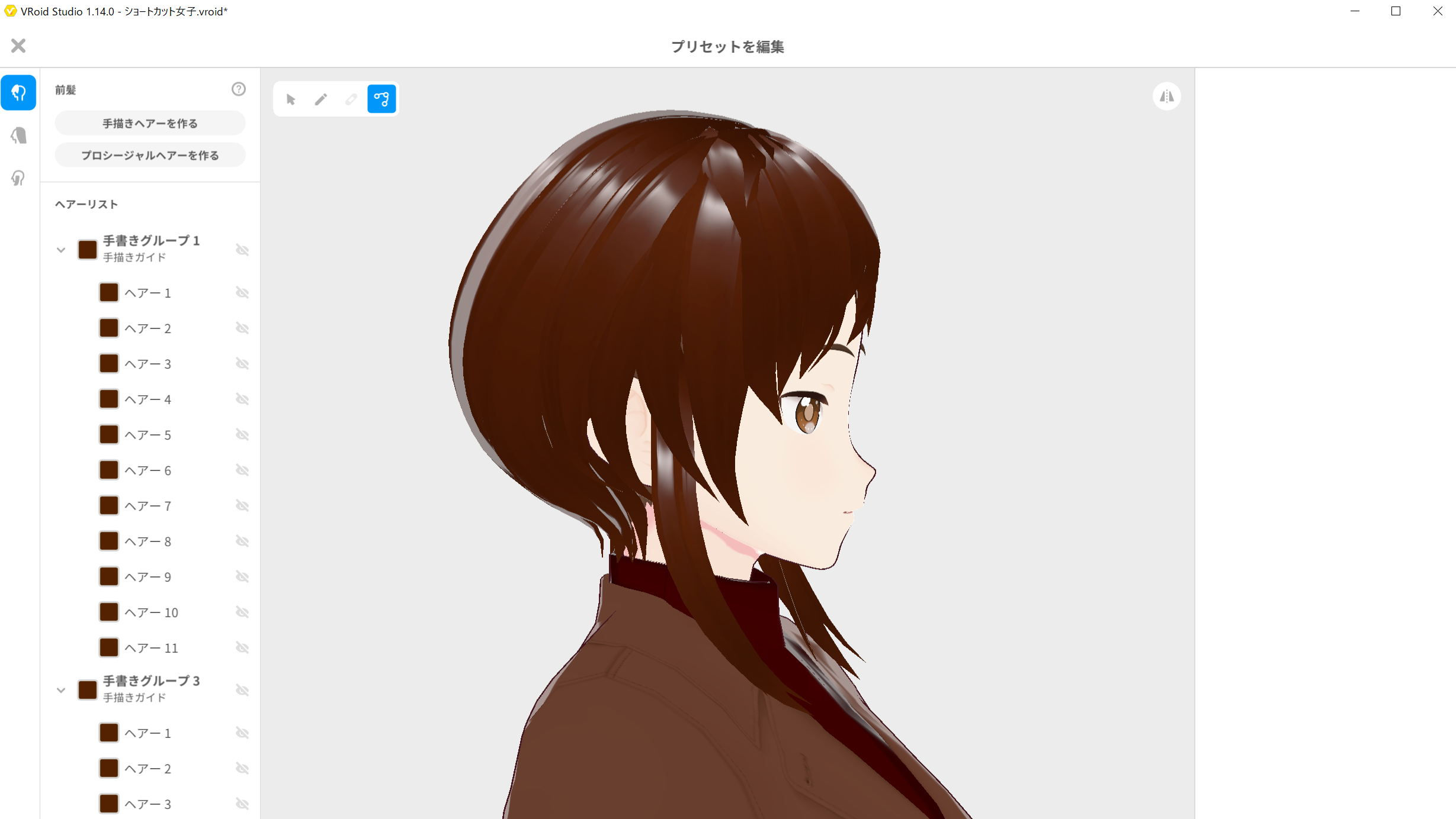 手書きグループ1を選択して、ヘアーパラメーターの位置(縦)のスライダーを左の動かしますと、髪が持ち上がりました。