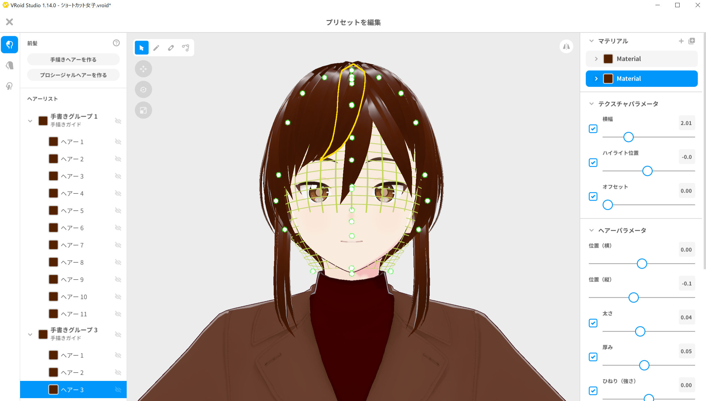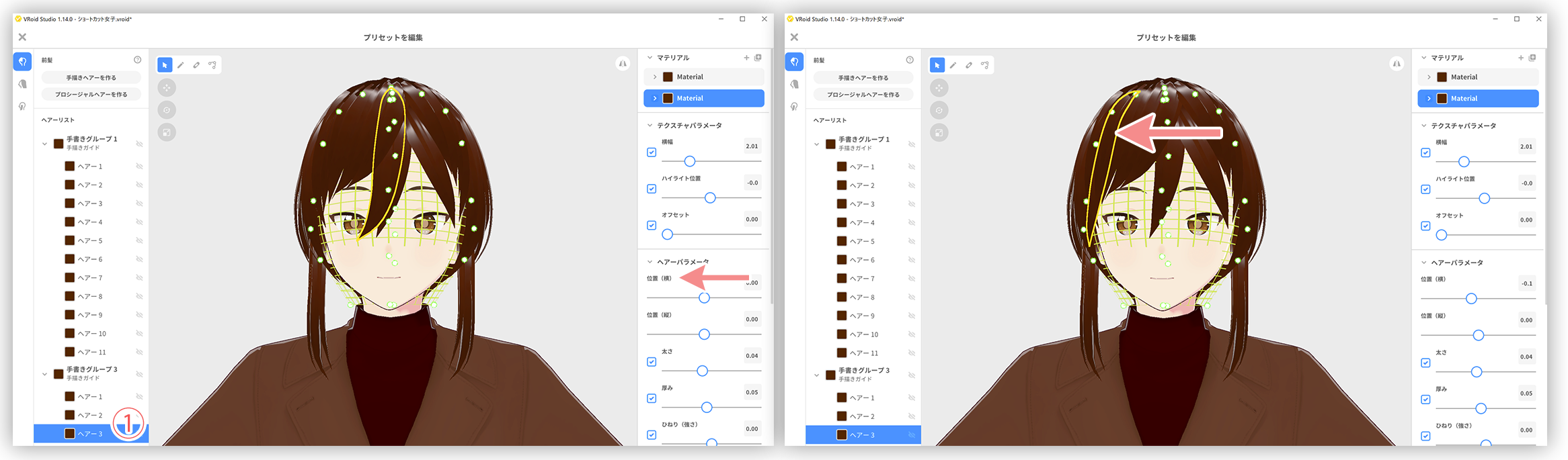 手書きグループ3にのヘアー3を選択しました。ヘアーパラメーターの位置(横)のスライダーを左に動かしますと、位置が左に移動しました。