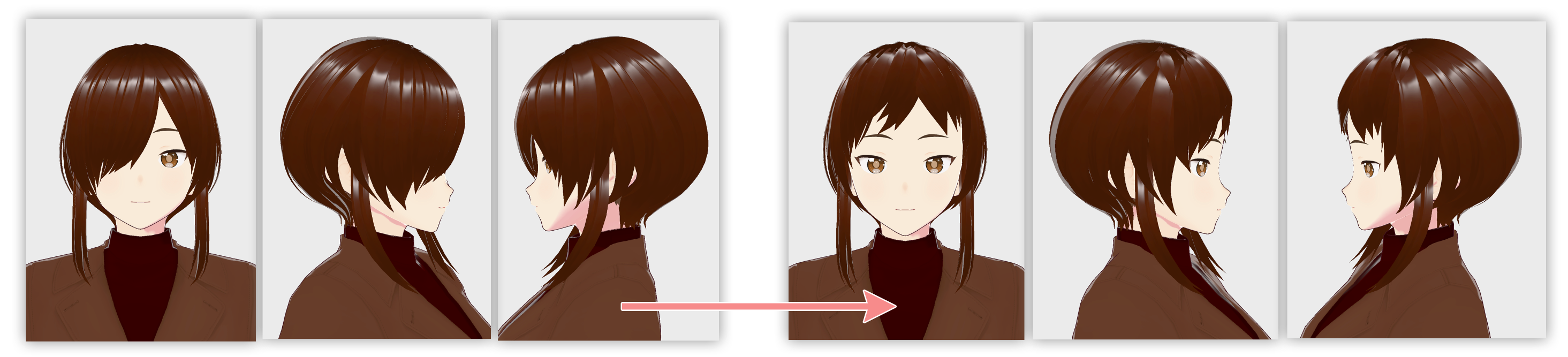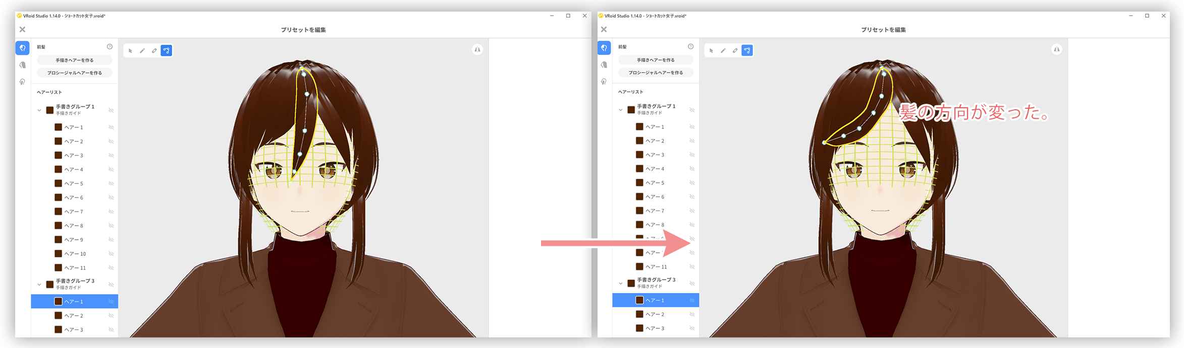 ヘアーパラメーターを使った位置(縦・横)の変更と太さの変更、もう一つは、制御点を使った長さと角度の調整です。