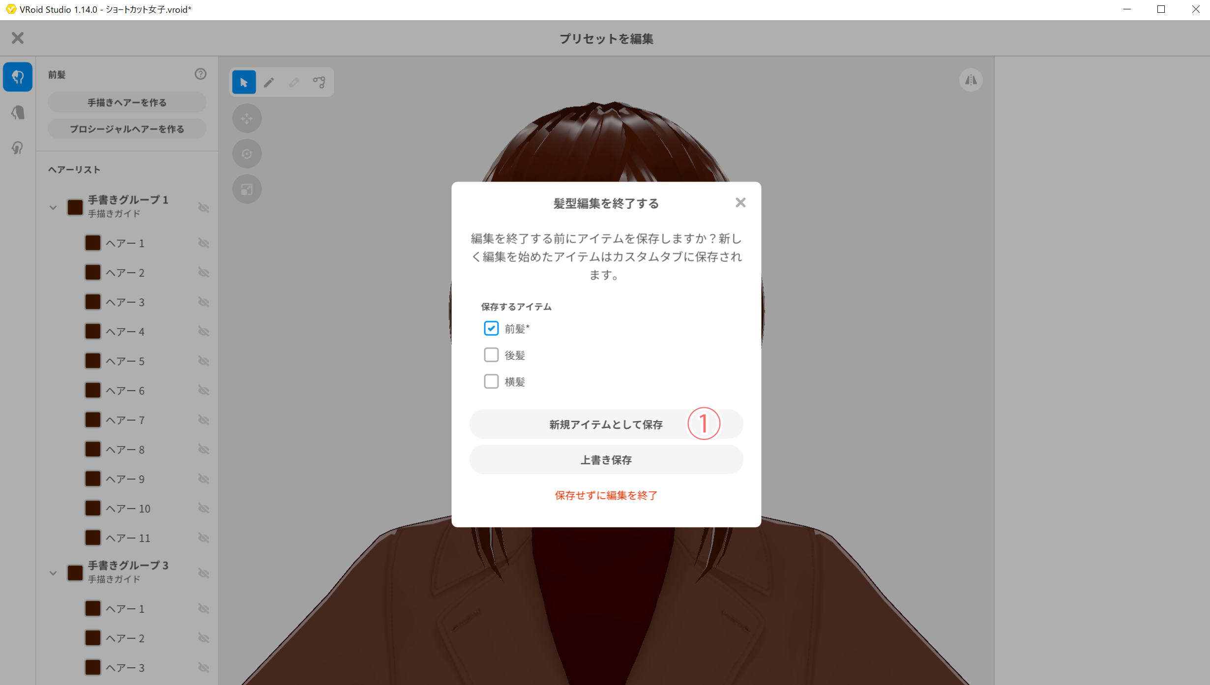 お気に入りの前髪スタイルが出来ましたら、①新規アイテムとして保存が出来ます。そうすると、他のアバターにも使える様になりますので、頑張って、チャレンジしてみて下さい。