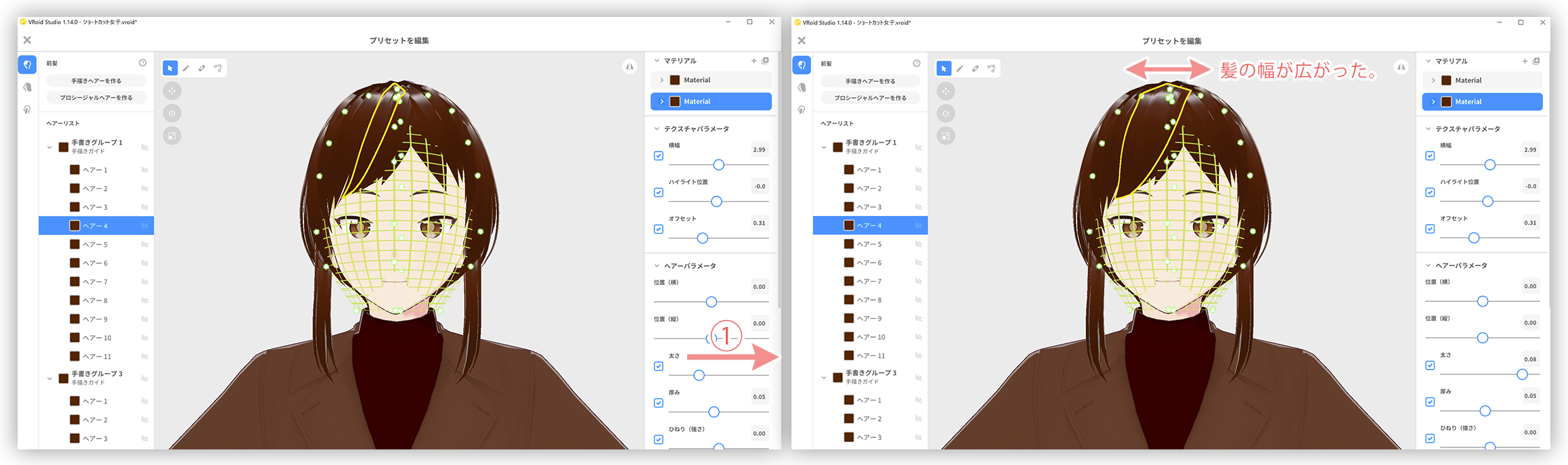 ①太さのスライダーを右の動かしますと、髪の部分の幅が、広がりました。これは、上手く移動出来たけど、地肌が見えたりする時に、有効です。