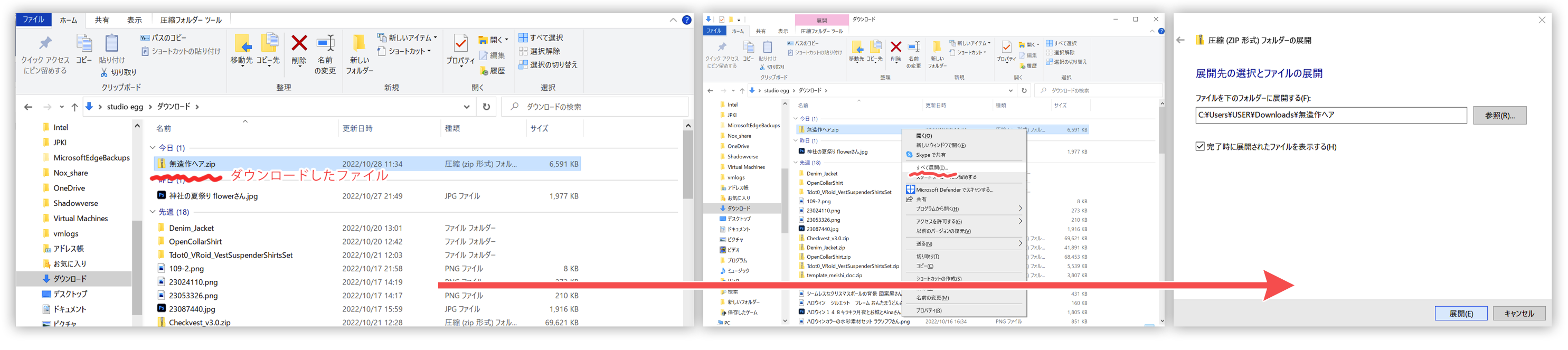 ダウンロードしたファイル(大体zipファイルなので)展開させて、任意の場所に保存します。