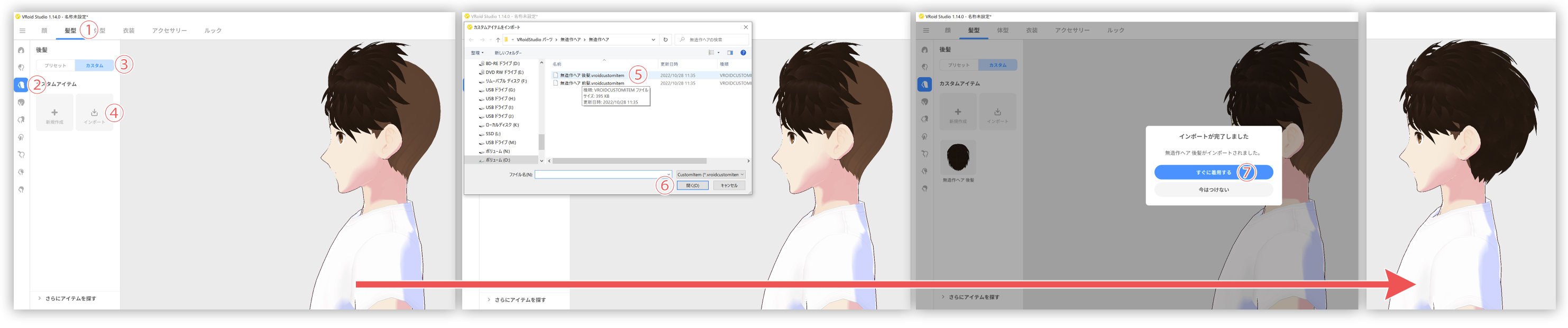 今回は、髪型を購入しましたので、①髪型、②前髪、③カスタム、④インポートと進みます。