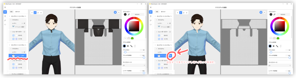 購入ページには、【正式版】 衣装のタグを開きます。 トップスのカスタムからロングコート(ハイネック)を追加してください。 カスタマイズのテクスチャを編集を開き、ロングコート(ハイネック)のレイヤーに本テクスチャをインポートします。