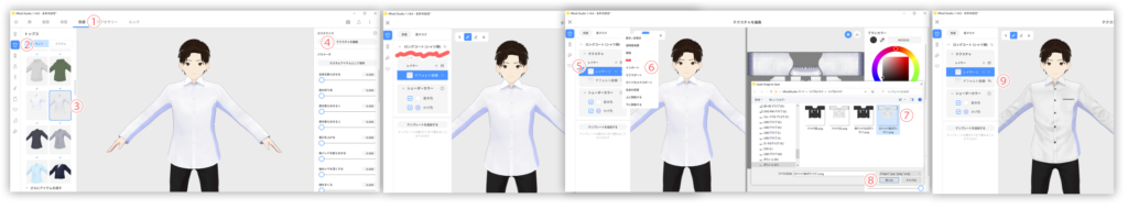 左側の選択項目には、名前が付いていないので、④テクスチャ編集をクリックして、選択した服装の種類を確認する必要が有ります。違う服装を選んでしまうと、形が上手く反映されません。