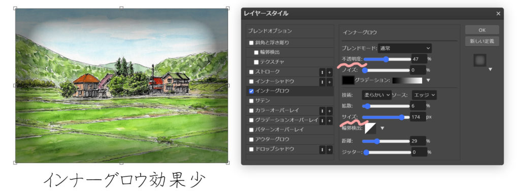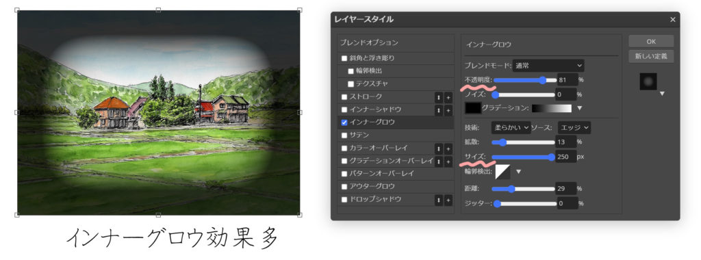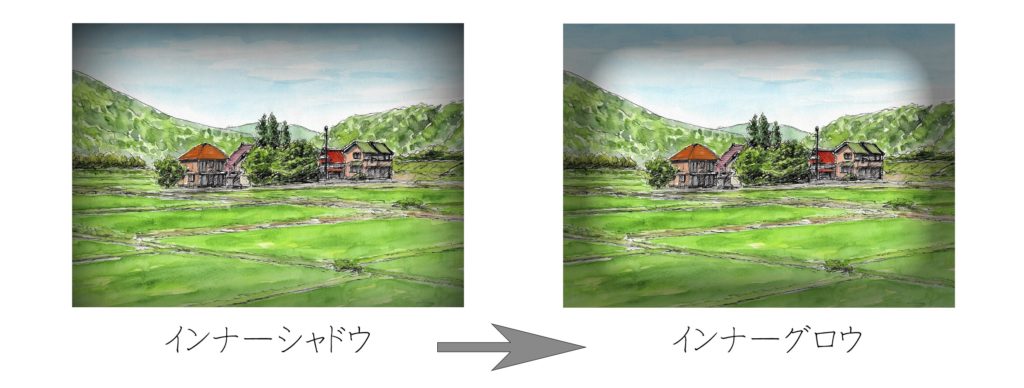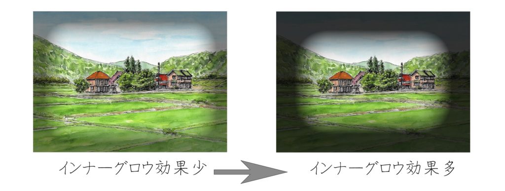 画像の周囲から効果が表れる物ですが、一番大きな違いは、インナーグロウは、周囲から均等に効果が出る物で、インナーシャドウは、影の出る角度を調整出来る為、何処か一辺の効果が薄くなる点です。