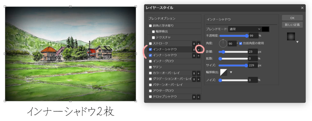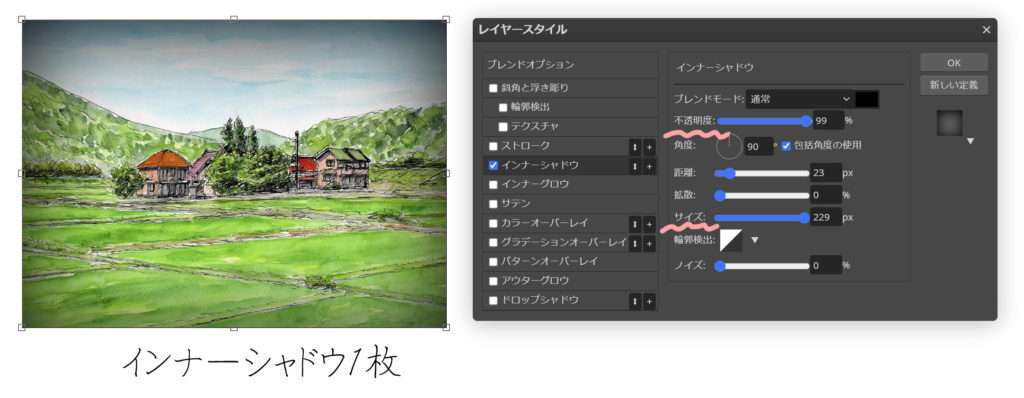 インナーシャドウを1枚で使用した場合、不透明度もサイズも最大で、この程度の効果が出ますが、もう少し、しっかりと効果を出したいなと思う場合は、重ね掛けすると良いです。