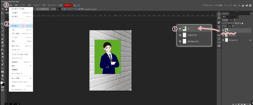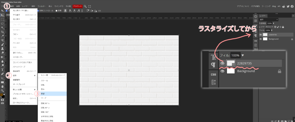- 先ず、乗せたレイヤーを①ラスタライズしてから(これをしないと作業出来ない)