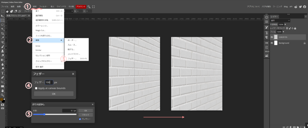 - 続いて、上段の①選択から、②編集、③フェザーと進みます。